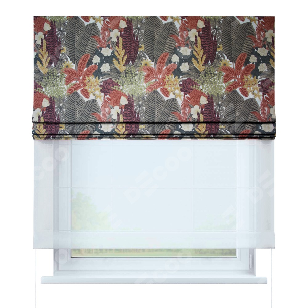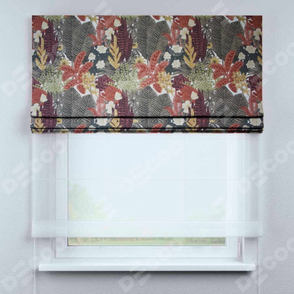 Римская штора день-ночь производителя «Cortin», используется для проёма, пошита из двух полотен, с лицевой стороны «Осень», вторая ткань тюль (по стандарту комплектуется тюль белого цвета артикул V-01). Имеет универсальный механизм и подходит для монтажа: на потолок, на стену и в нишу.