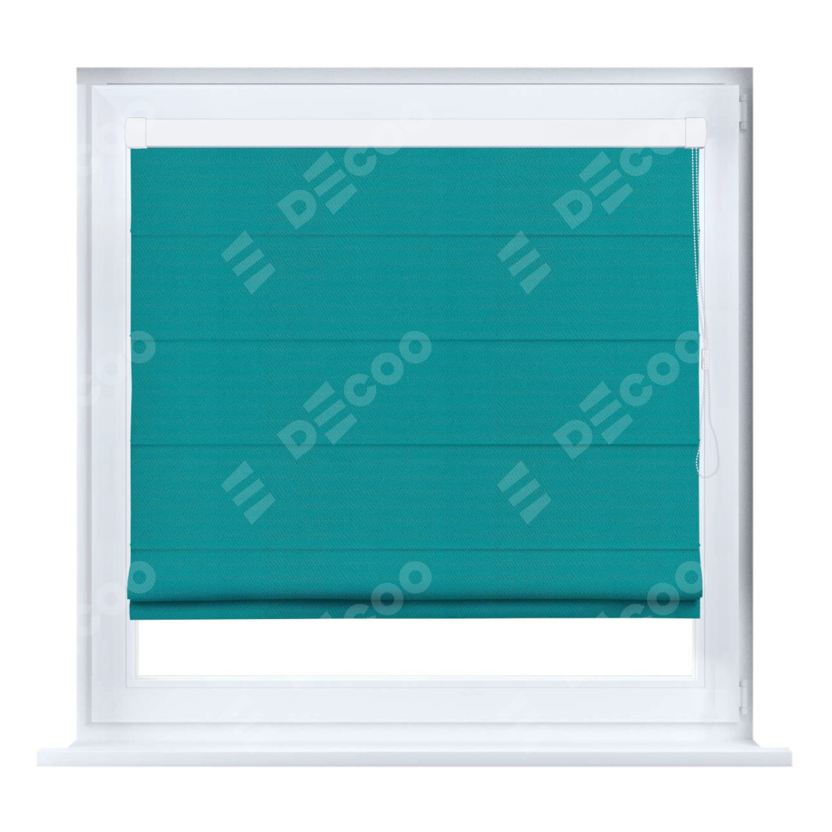 Римская штора кассетного типа, производителя «Cortin», устанавливается только на пластиковые окна и прилегает к стеклопакету, пошита из ткани блэкаут однотонный бирюзовый, артикул 88297.
