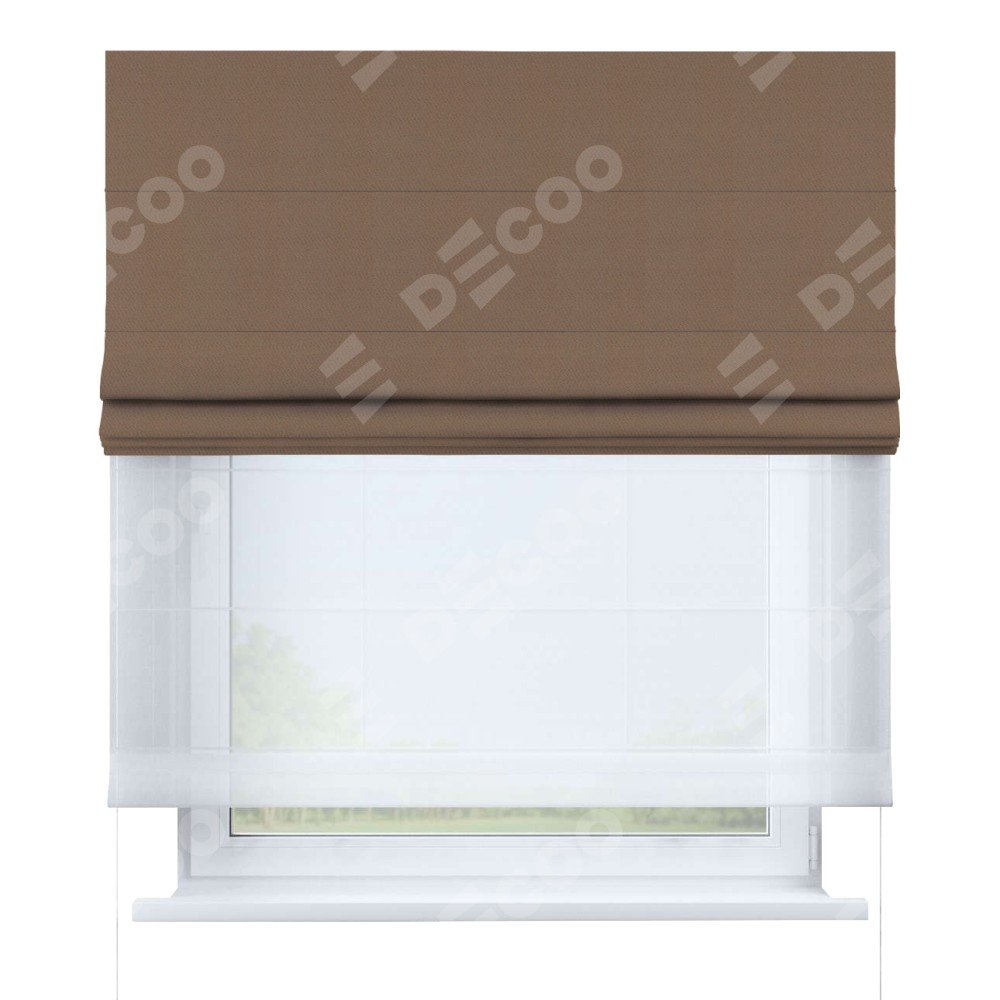 Римская штора день-ночь производителя «Cortin», используется для проёма, пошита из двух полотен, с лицевой стороны блэкаут однотонный коричневый артикул 88285, вторая ткань тюль (по стандарту комплектуется тюль белого цвета артикул V-01). Имеет универсальный механизм и подходит для монтажа: на потолок, на стену и в нишу.