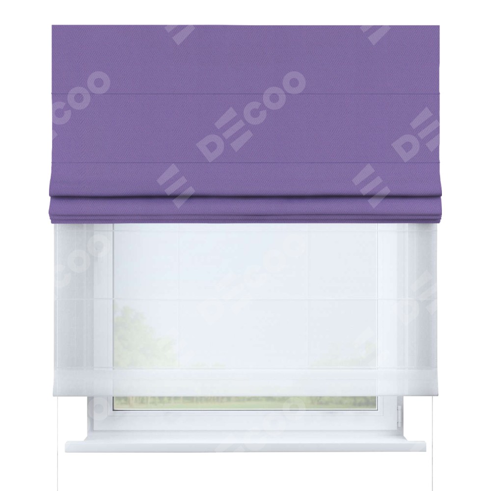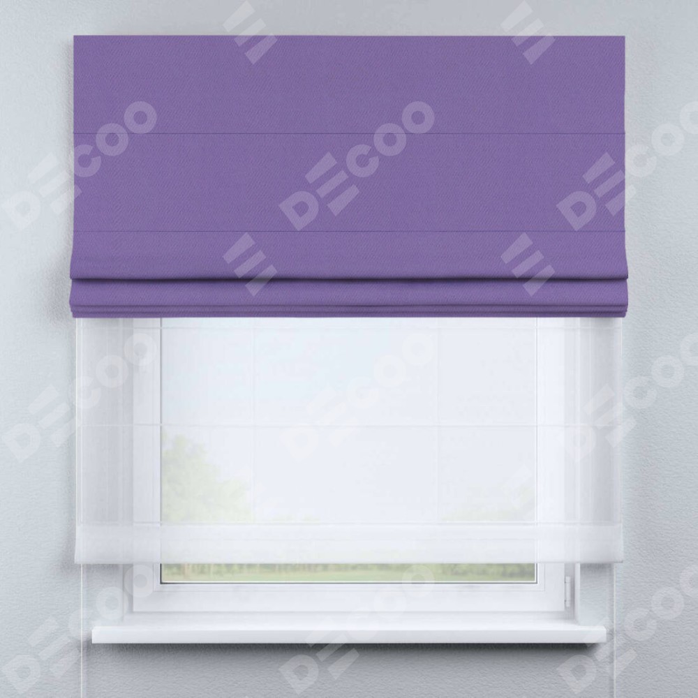 Римская штора день-ночь производителя «Cortin», используется для проёма, пошита из двух полотен, с лицевой стороны блэкаут однотонный сиреневый артикул 88305, вторая ткань тюль (по стандарту комплектуется тюль белого цвета артикул V-01). Имеет универсальный механизм и подходит для монтажа: на потолок, на стену и в нишу.