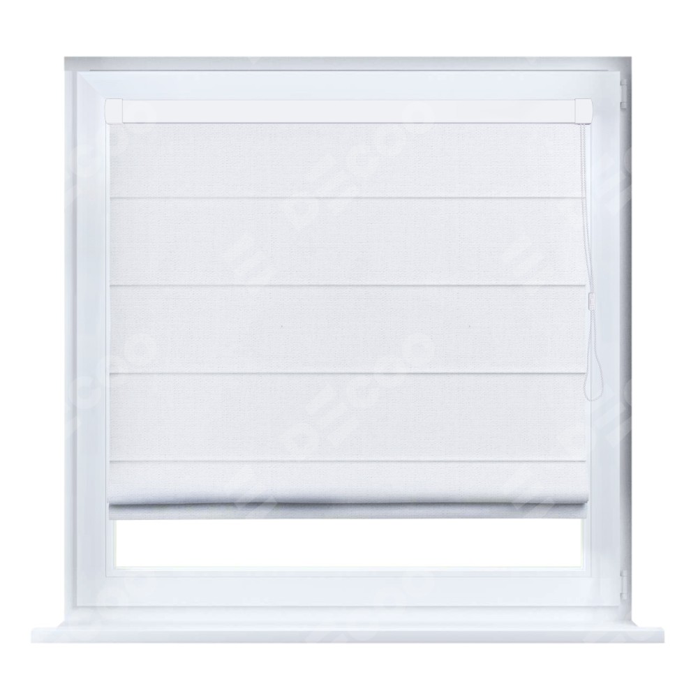 Римская штора кассетного типа, производителя «Cortin», устанавливается только на пластиковые окна и прилегает к стеклопакету, пошита из ткани лён белый, артикул 53430.