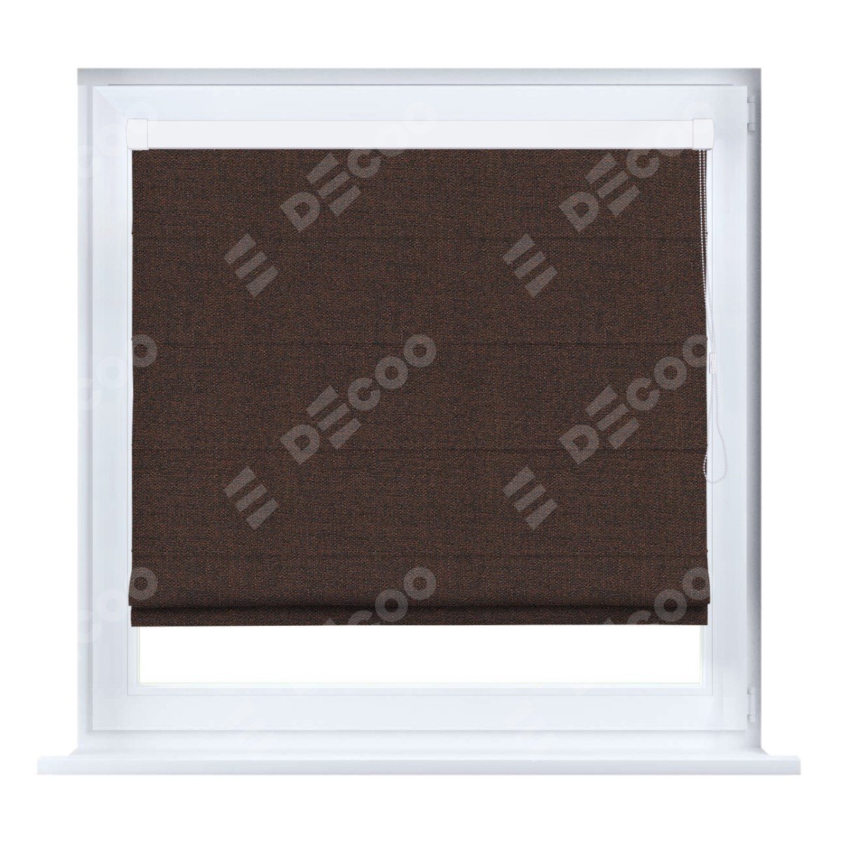 Римская штора производителя «Cortin», устанавливается на створку окна, пошита из ткани лён коричневый, артикул 53443. Штора шьётся по индивидуальным размерам, для данного типа римской шторы возможная ширина от 35 до 150 см., высота до 250 см.