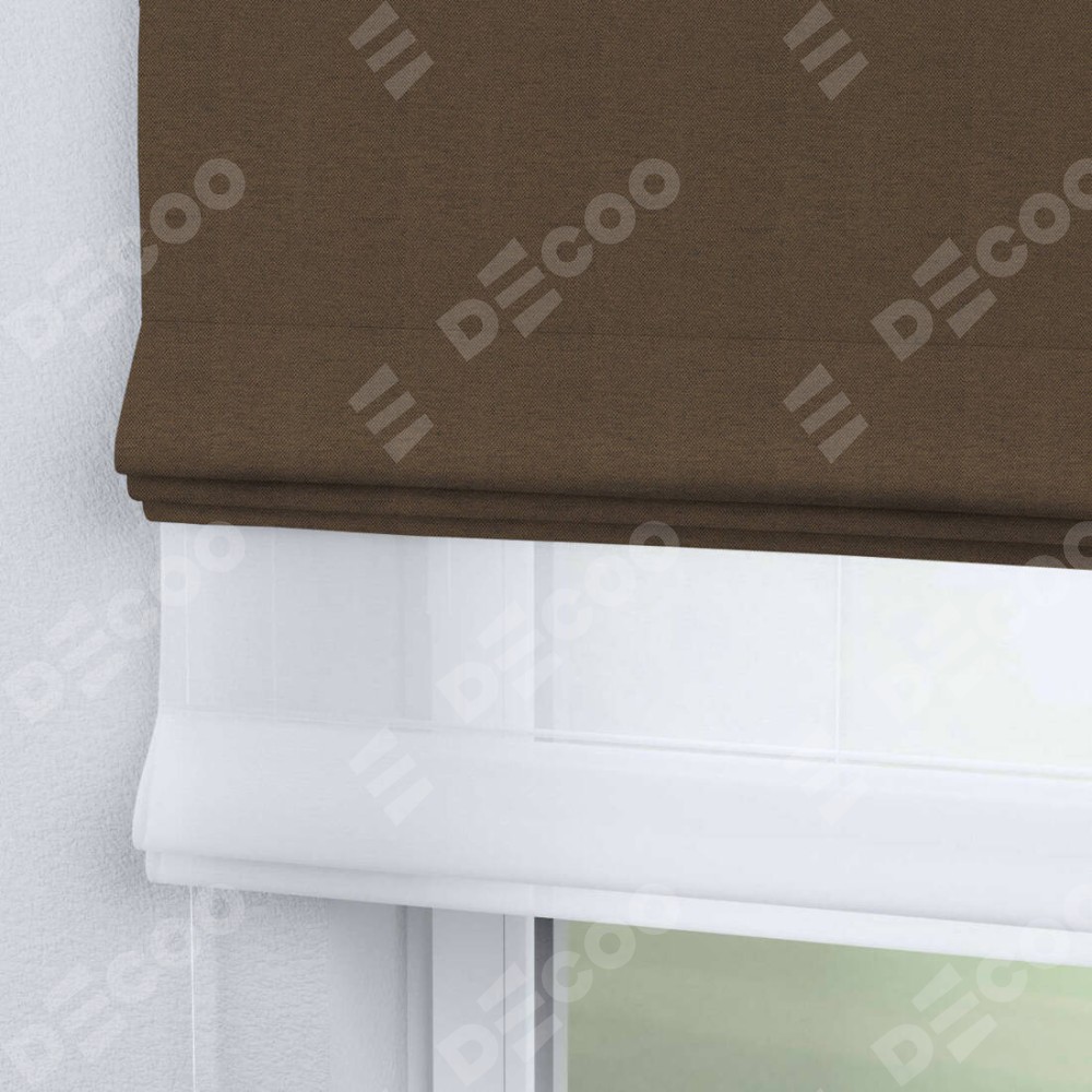 Римская штора день-ночь производителя «Cortin», используется для проёма, пошита из двух полотен, с лицевой стороны лён димаут тёмно-коричневый артикул 83030, вторая ткань тюль (по стандарту комплектуется тюль белого цвета артикул V-01). Имеет универсальный механизм и подходит для монтажа: на потолок, на стену и в нишу.