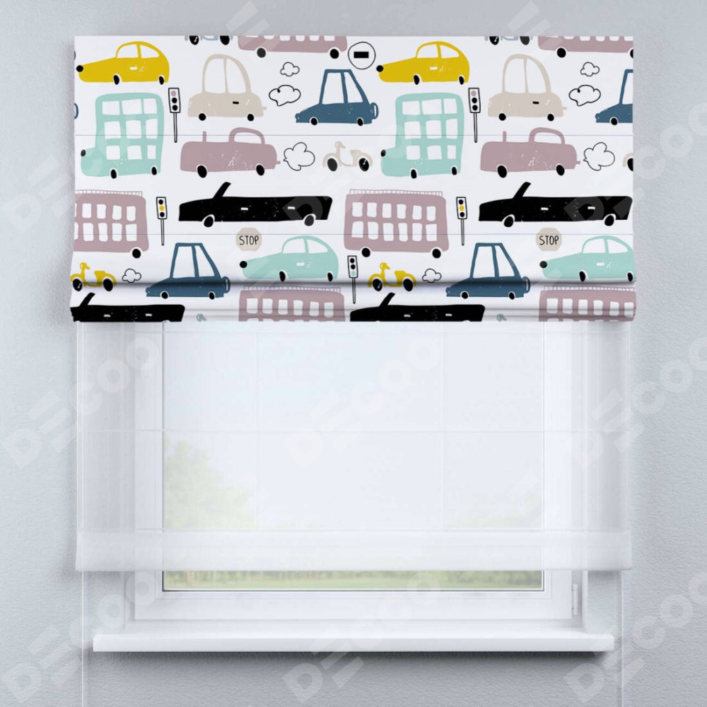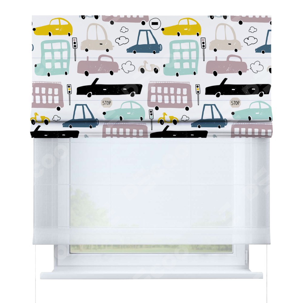 Римская штора день-ночь производителя «Cortin», используется для проёма, пошита из двух полотен, с лицевой блэкаут с нанесением сублимационной печати «Красочный трафик», вторая ткань тюль (по стандарту комплектуется тюль белого цвета артикул V-01). Имеет универсальный механизм и подходит для монтажа: на потолок, на стену и в нишу.