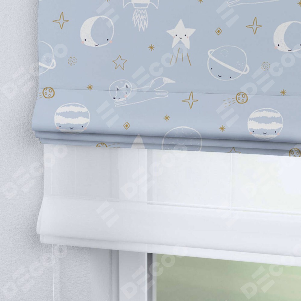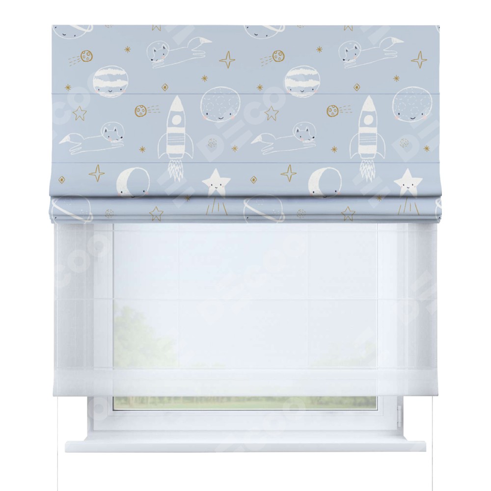 Римская штора день-ночь производителя «Cortin», используется для проёма, пошита из двух полотен, с лицевой блэкаут с нанесением сублимационной печати «Прекрасная вселенная», вторая ткань тюль (по стандарту комплектуется тюль белого цвета артикул V-01). Имеет универсальный механизм и подходит для монтажа: на потолок, на стену и в нишу.