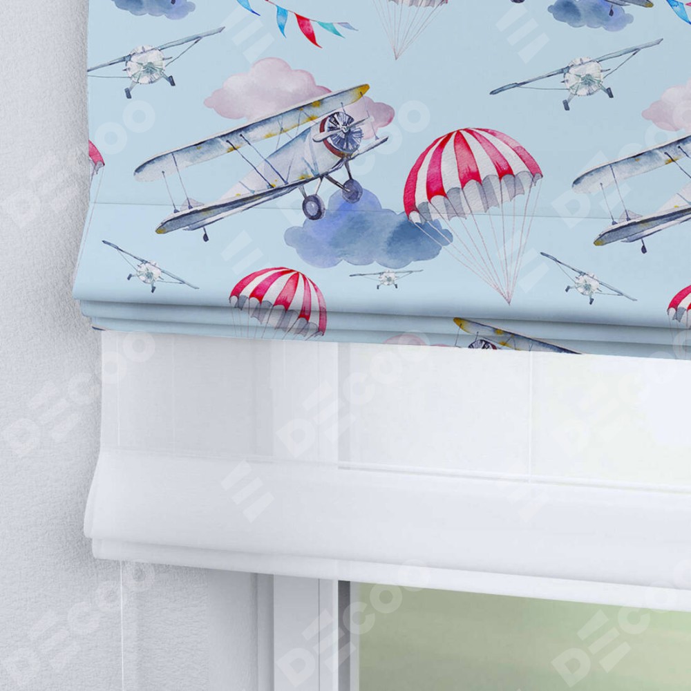 Римская штора день-ночь производителя «Cortin», используется для проёма, пошита из двух полотен, с лицевой блэкаут с нанесением сублимационной печати «Самолёт», вторая ткань тюль (по стандарту комплектуется тюль белого цвета артикул V-01). Имеет универсальный механизм и подходит для монтажа: на потолок, на стену и в нишу.