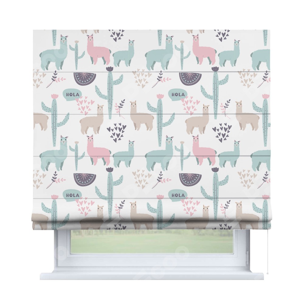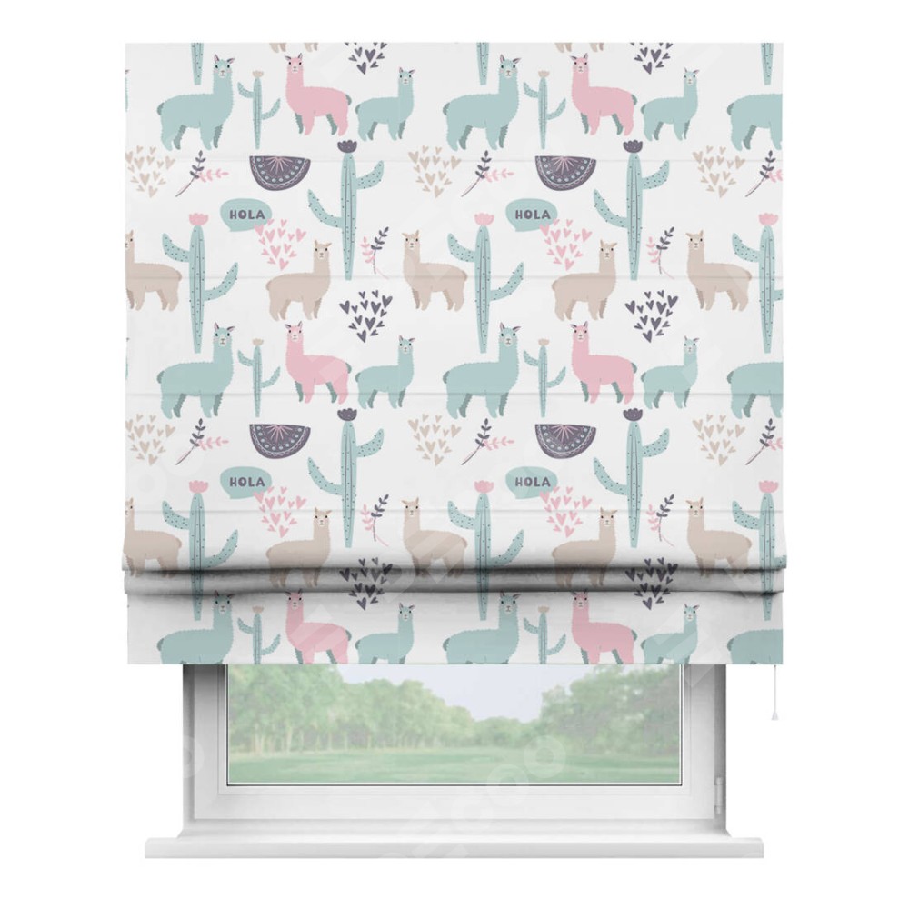 Римская штора производителя «Cortin», используется для проёма, пошита из ткани блэкаут с нанесением сублимационной печати «Милый лама». Имеет универсальный механизм и подходит для монтажа: на потолок, на стену и в нишу.