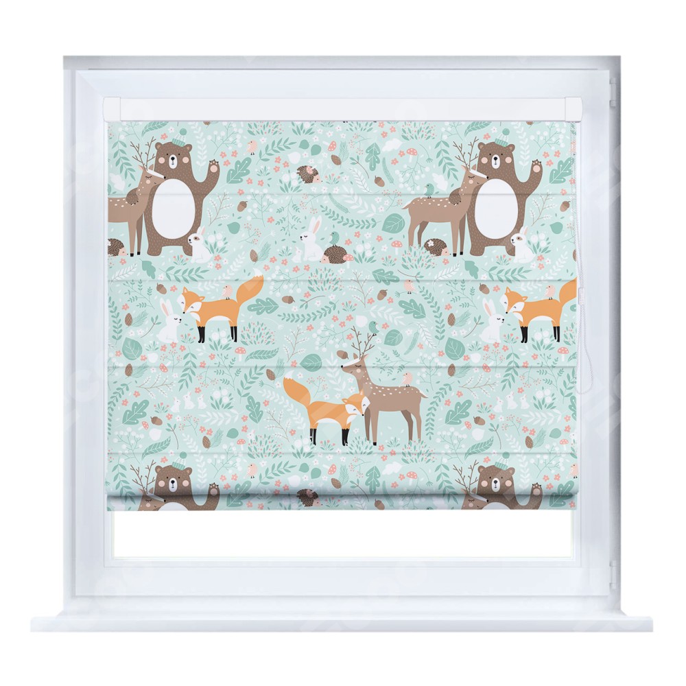Римская штора кассетного типа, производителя «Cortin», устанавливается только на пластиковые окна и прилегает к стеклопакету, пошита из ткани блэкаут с нанесением сублимационной печати «Лесные друзья».