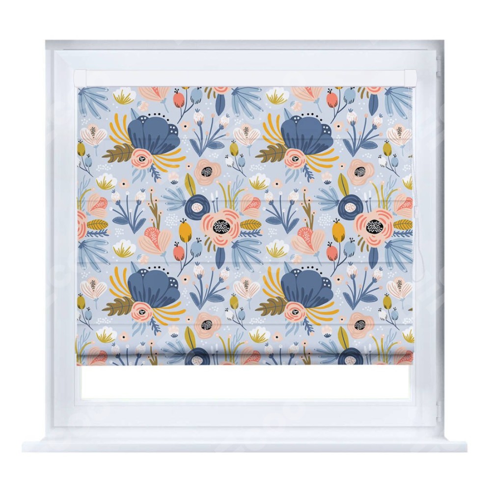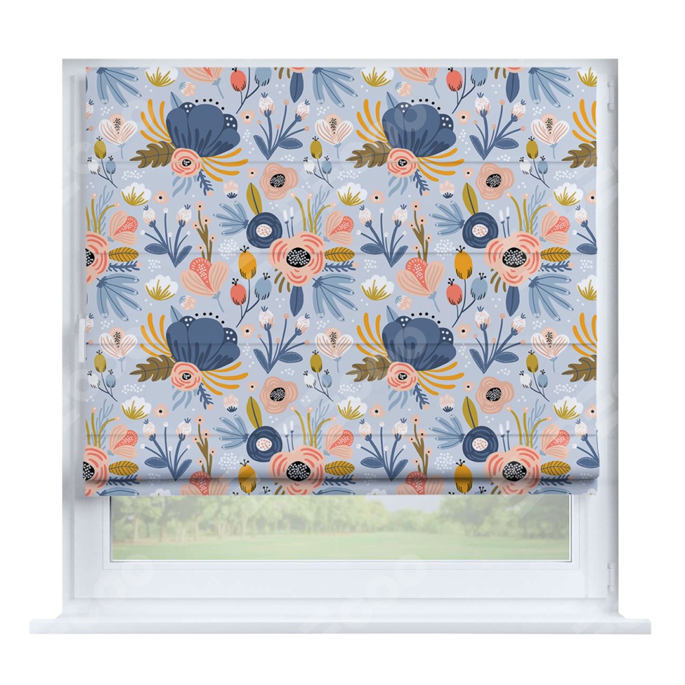 Римская штора производителя «Cortin», устанавливается на створку окна, пошита из ткани блэкаут с нанесением сублимационной печати «Волшебные цветы». Штора шьётся по индивидуальным размерам, для данного типа римской шторы возможная ширина от 35 до 150 см., высота до 250 см.