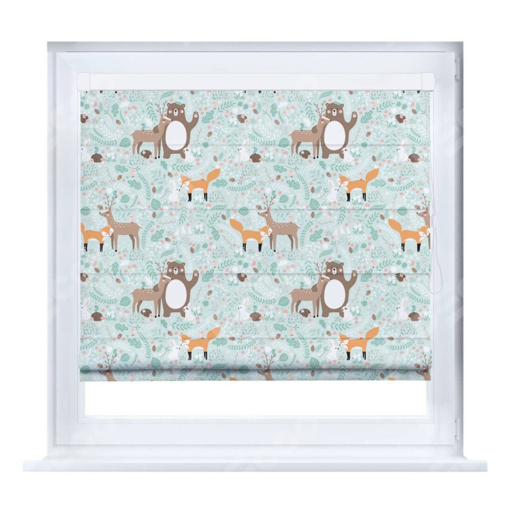 Римская штора производителя «Cortin», устанавливается на створку окна, пошита из ткани блэкаут с нанесением сублимационной печати «Лесные друзья». Штора шьётся по индивидуальным размерам, для данного типа римской шторы возможная ширина от 35 до 150 см., высота до 250 см.