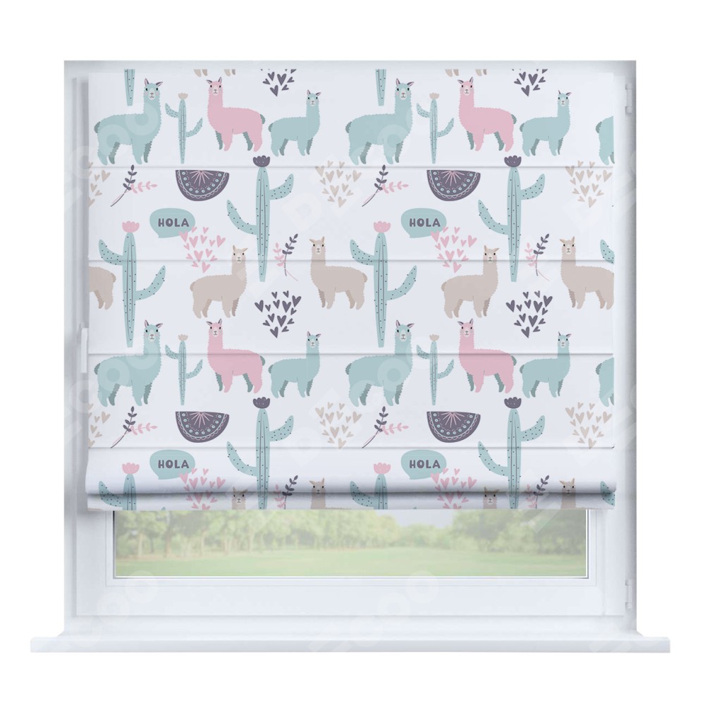 Римская штора производителя «Cortin», устанавливается на створку окна, пошита из ткани блэкаут с нанесением сублимационной печати «Милый лама». Штора шьётся по индивидуальным размерам, для данного типа римской шторы возможная ширина от 35 до 150 см., высота до 250 см.