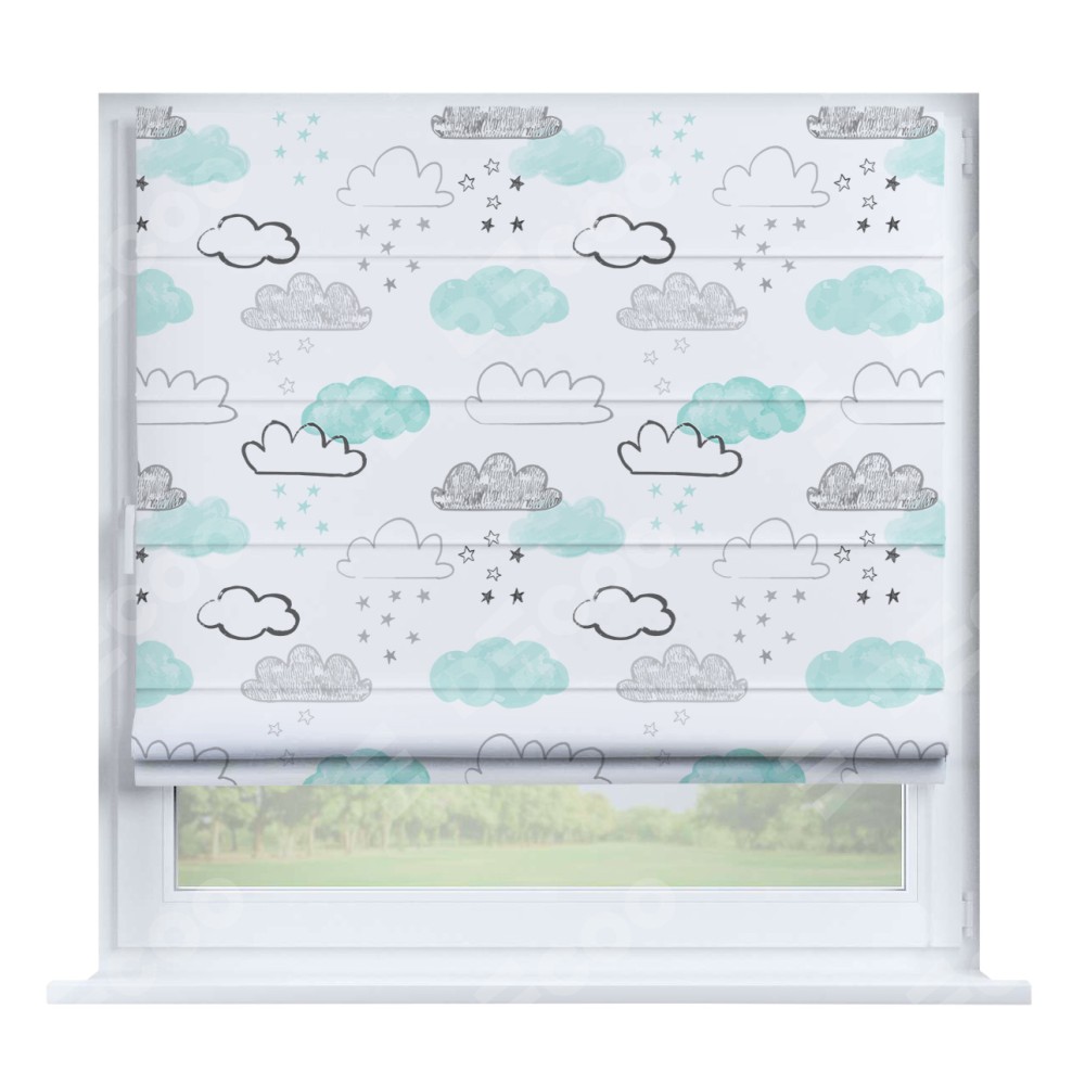 Римская штора производителя «Cortin», устанавливается на створку окна, пошита из ткани блэкаут с нанесением сублимационной печати «Облака и звёзды». Штора шьётся по индивидуальным размерам, для данного типа римской шторы возможная ширина от 35 до 150 см., высота до 250 см.