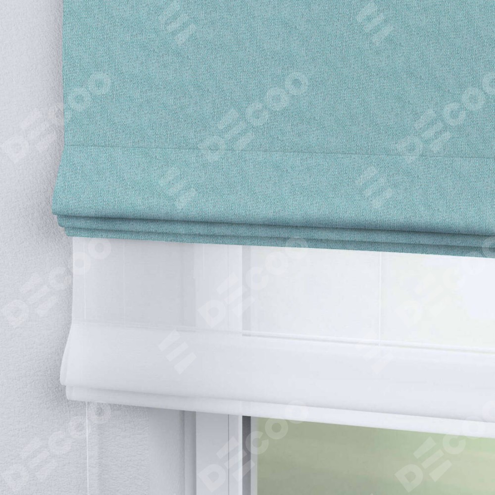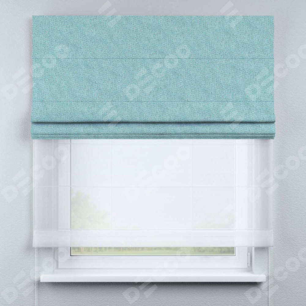 Римская штора день-ночь производителя «Cortin», используется для проёма, пошита из двух полотен, с лицевой стороны лён димаут бирюзовый артикул 23, вторая ткань тюль (по стандарту комплектуется тюль белого цвета артикул V-01). Имеет универсальный механизм и подходит для монтажа: на потолок, на стену и в нишу.