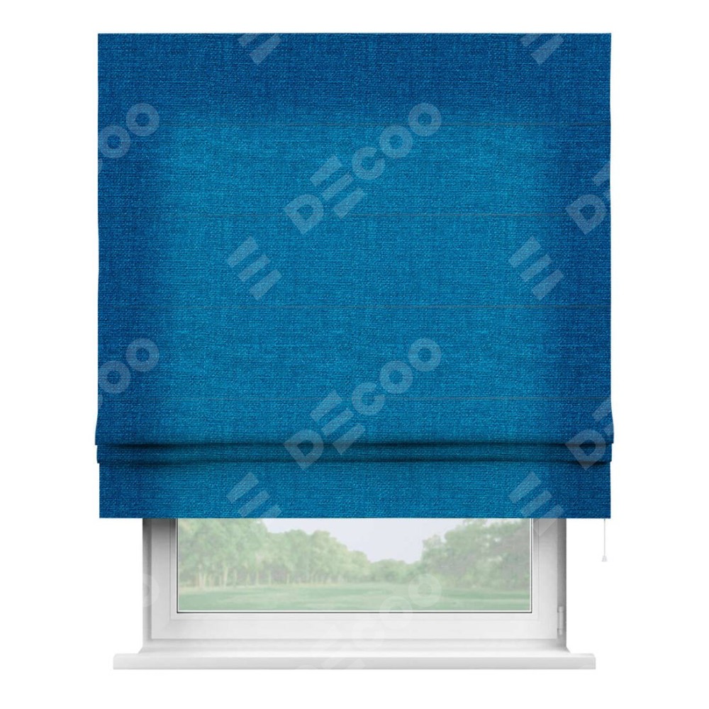Римская штора производителя «Cortin», используется для проёма, пошита из ткани лён синий, артикул ткани 63742. Имеет универсальный механизм и подходит для монтажа: на потолок, на стену и в нишу.