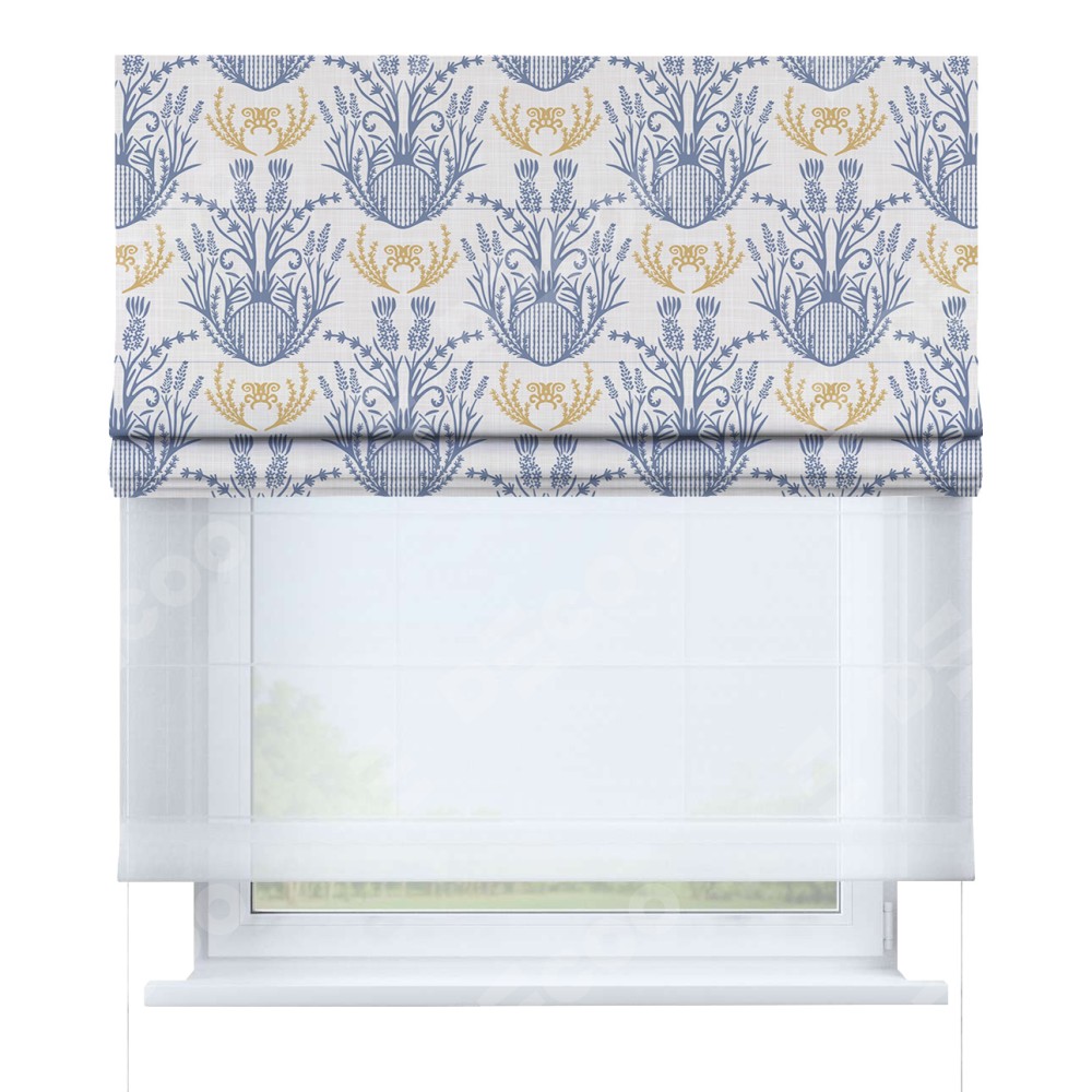 Римская штора день-ночь производителя «Cortin», используется для проёма, пошита из двух полотен, с лицевой блэкаут с нанесением сублимационной печати «Шикарная лаванда», вторая ткань тюль (по стандарту комплектуется тюль белого цвета артикул V-01). Имеет универсальный механизм и подходит для монтажа: на потолок, на стену и в нишу.