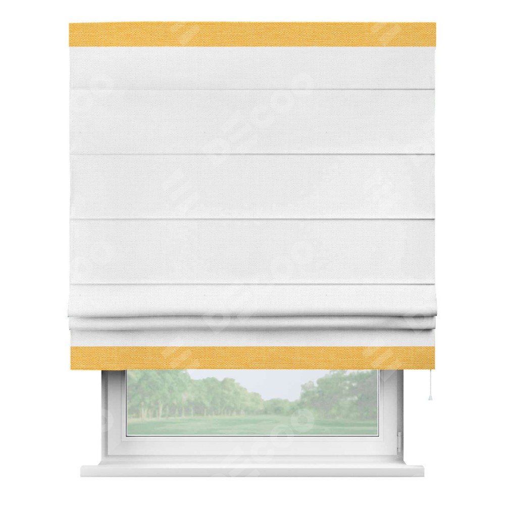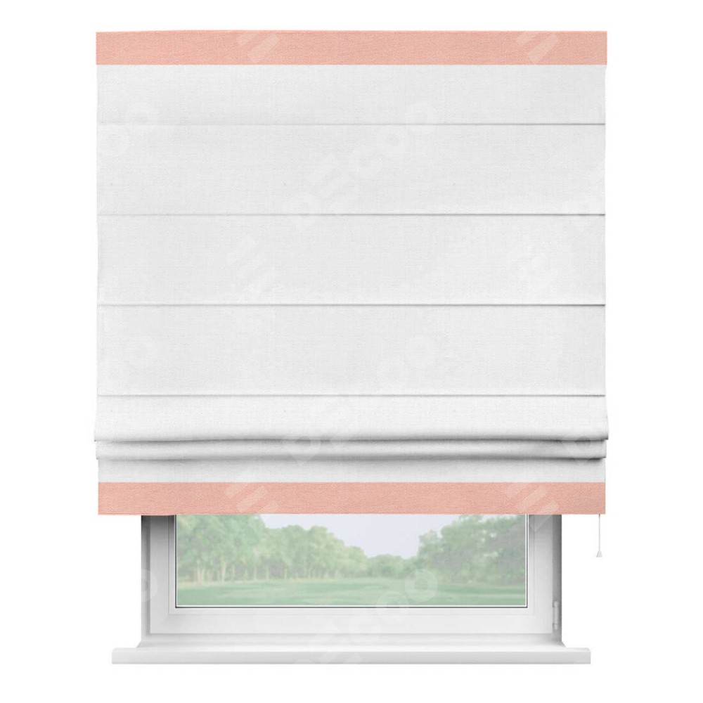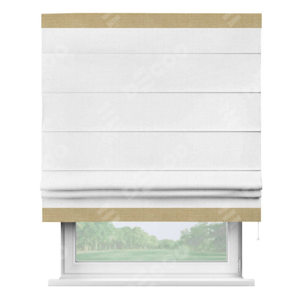 Римская штора производителя «Cortin», используется для проёма, пошита из ткани лён белый, артикул 53430. Отделка шторы кантом «Горизонт», ткань для канта используется из льна разной расцветки на выбор. Имеет универсальный механизм и подходит для монтажа: на потолок, на стену и в нишу.