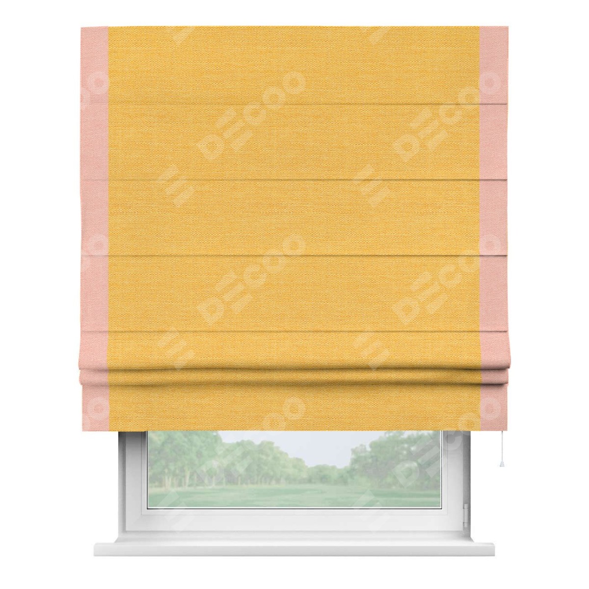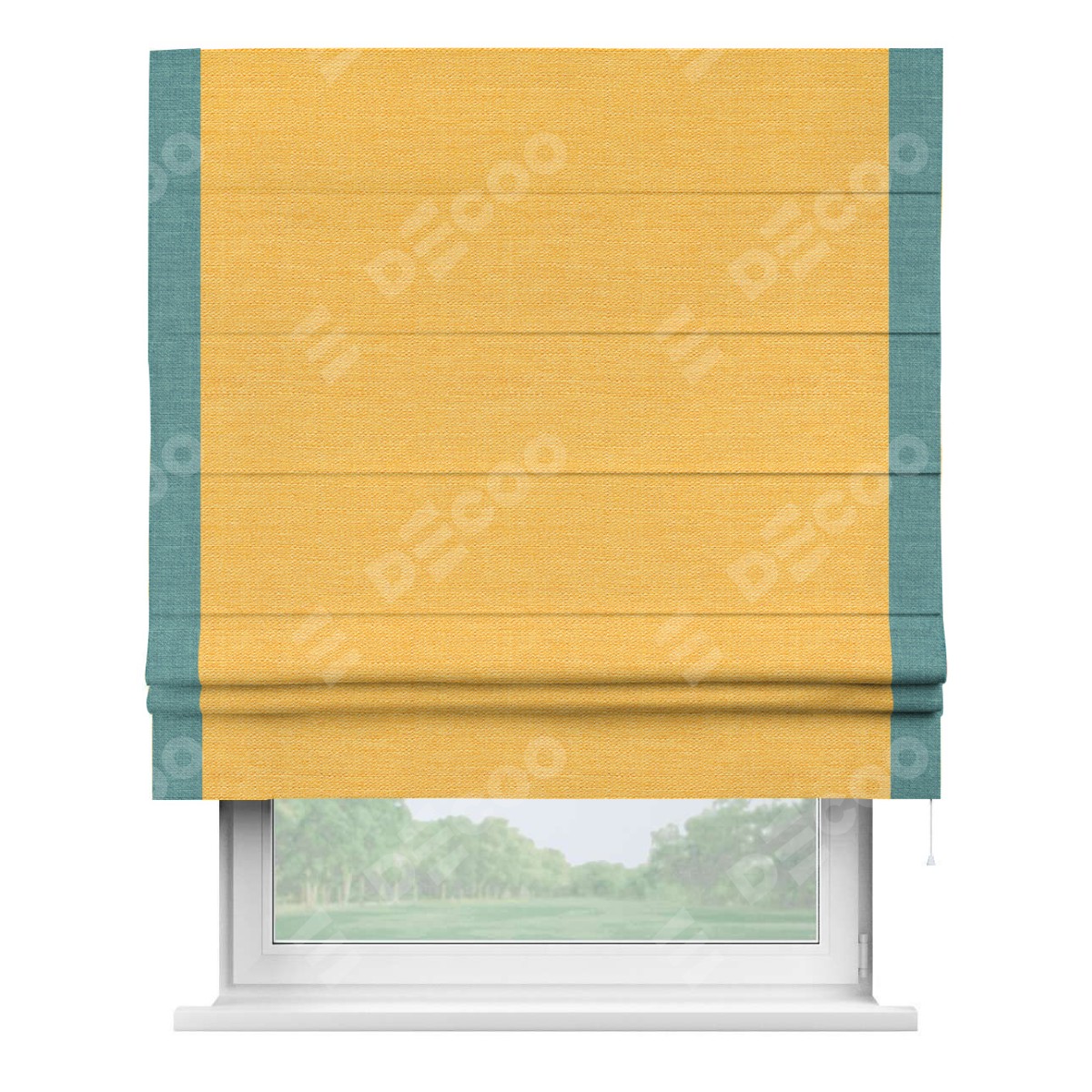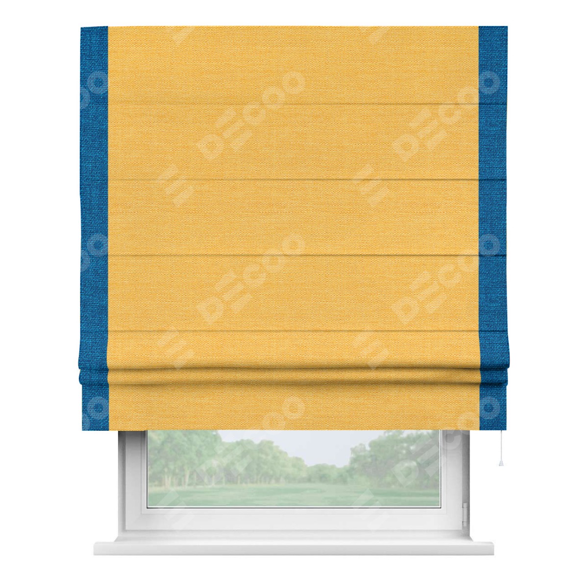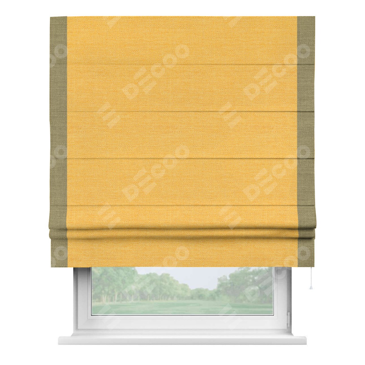 Римская штора производителя «Cortin», используется для проёма, пошита из ткани лён желтый, артикул 63738. Отделка шторы кантом «Стрим Дуо», ткань для канта используется из льна разной расцветки на выбор. Имеет универсальный механизм и подходит для монтажа: на потолок, на стену и в нишу.