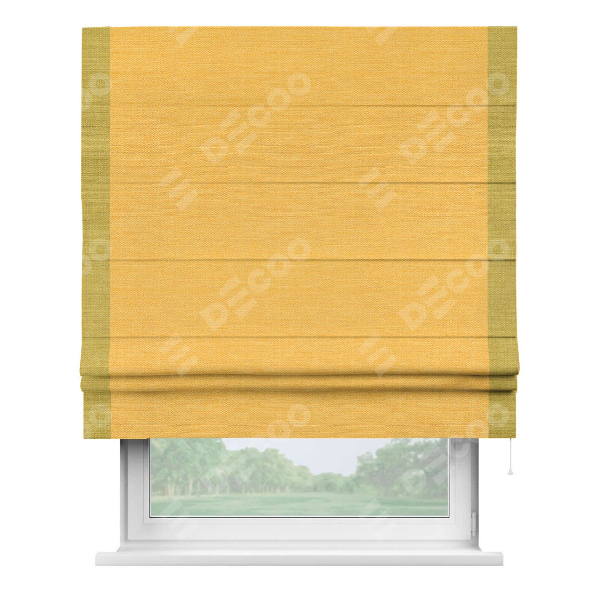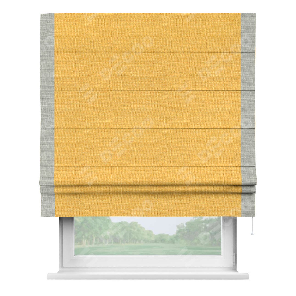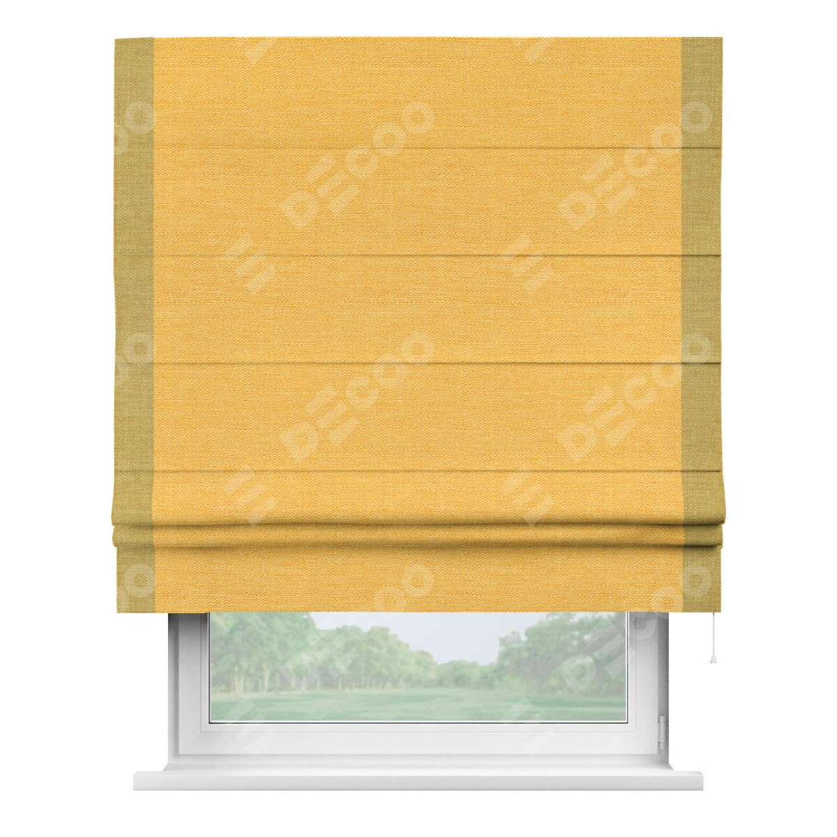 Римская штора производителя «Cortin», используется для проёма, пошита из ткани лён желтый, артикул 63738. Отделка шторы кантом «Стрим Дуо», ткань для канта используется из льна разной расцветки на выбор. Имеет универсальный механизм и подходит для монтажа: на потолок, на стену и в нишу.