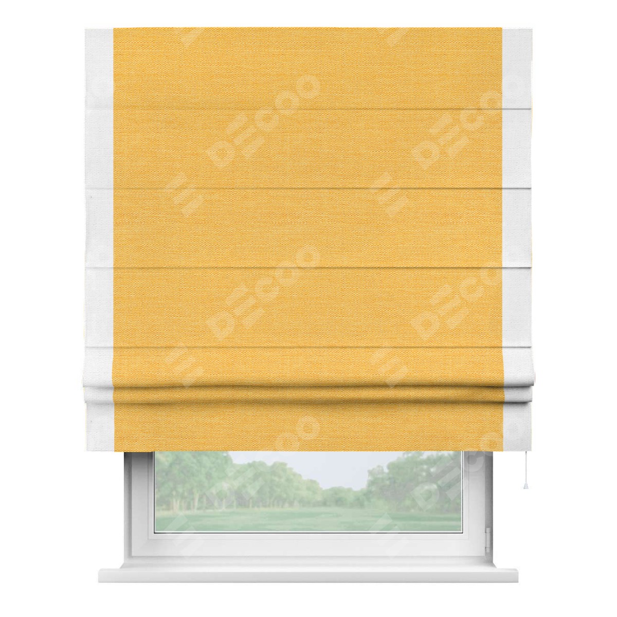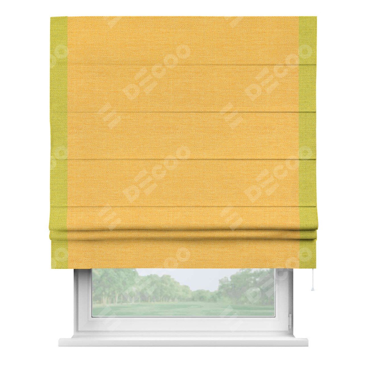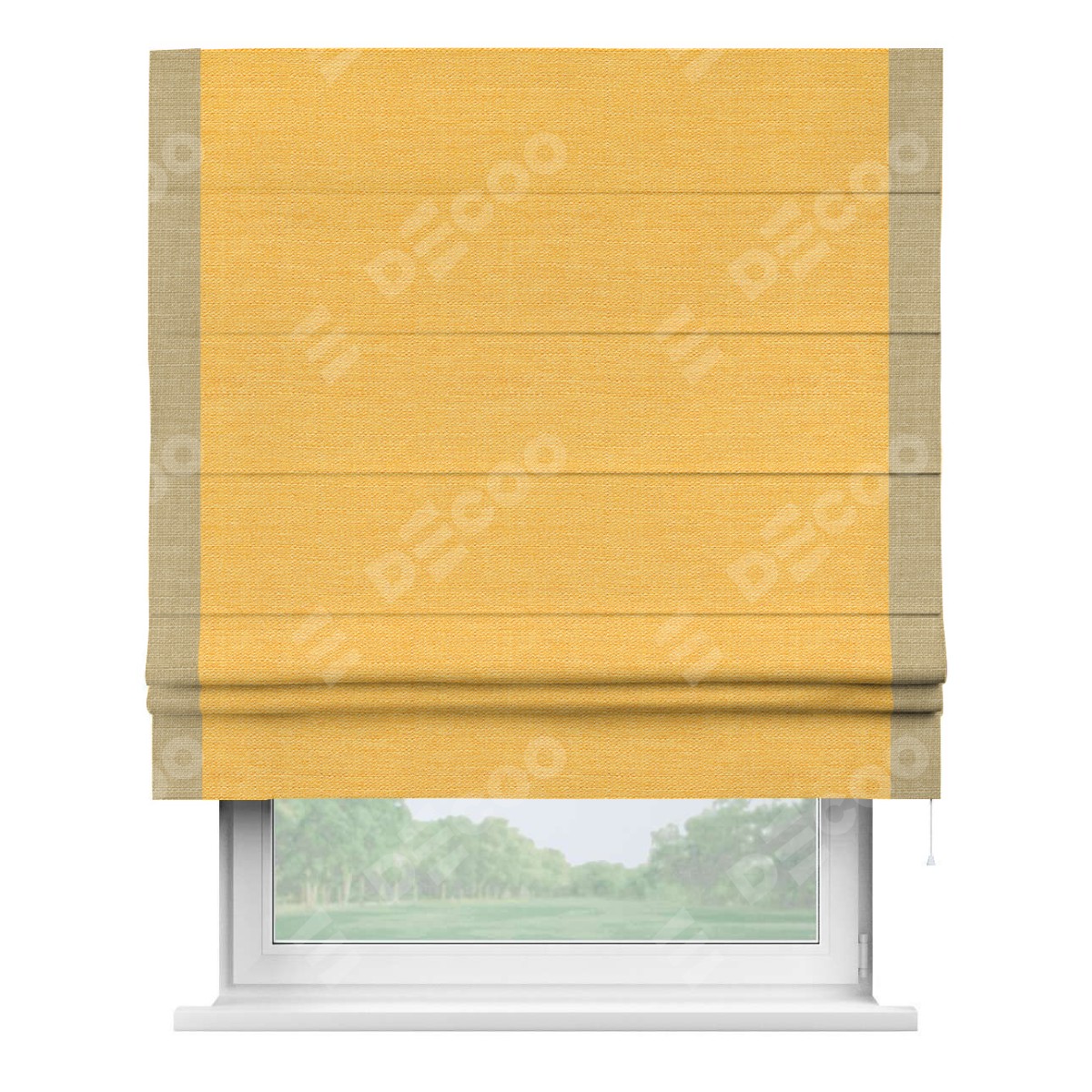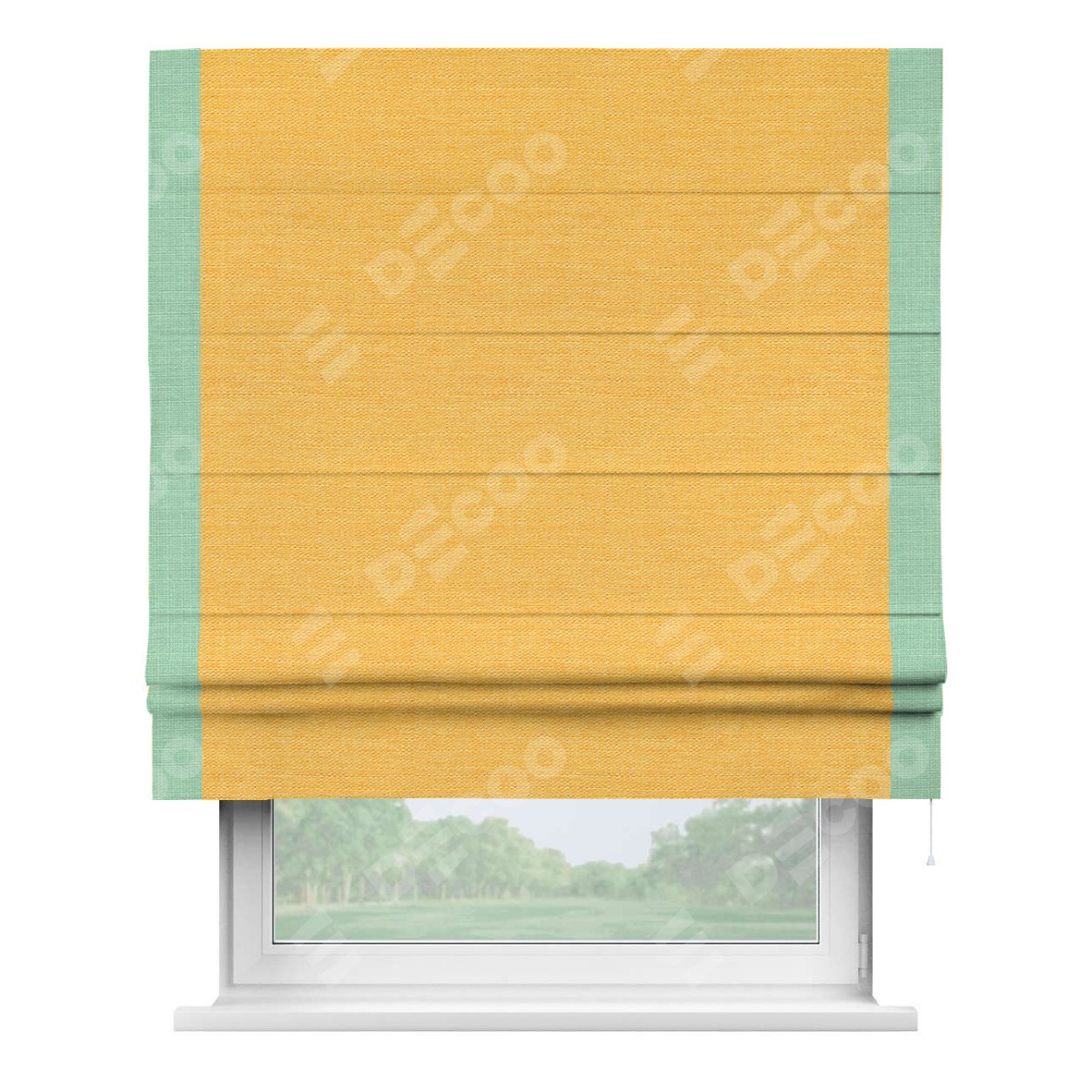 Римская штора производителя «Cortin», используется для проёма, пошита из ткани лён желтый, артикул 63738. Отделка шторы кантом «Стрим Дуо», ткань для канта используется из льна разной расцветки на выбор. Имеет универсальный механизм и подходит для монтажа: на потолок, на стену и в нишу.