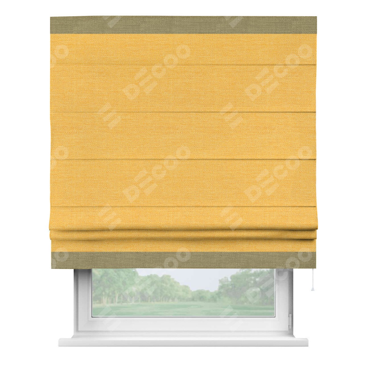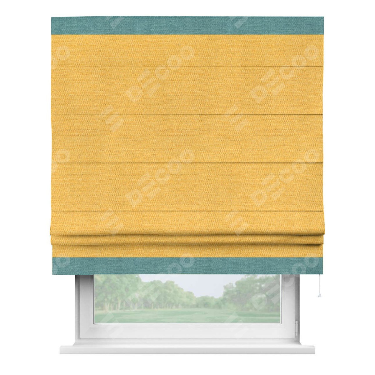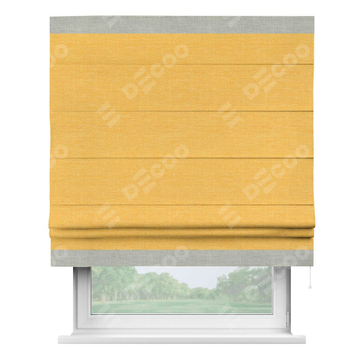 Римская штора производителя «Cortin», используется для проёма, пошита из ткани лён желтый, артикул 63738. Отделка шторы кантом «Горизонт», ткань для канта используется из льна разной расцветки на выбор. Имеет универсальный механизм и подходит для монтажа: на потолок, на стену и в нишу.