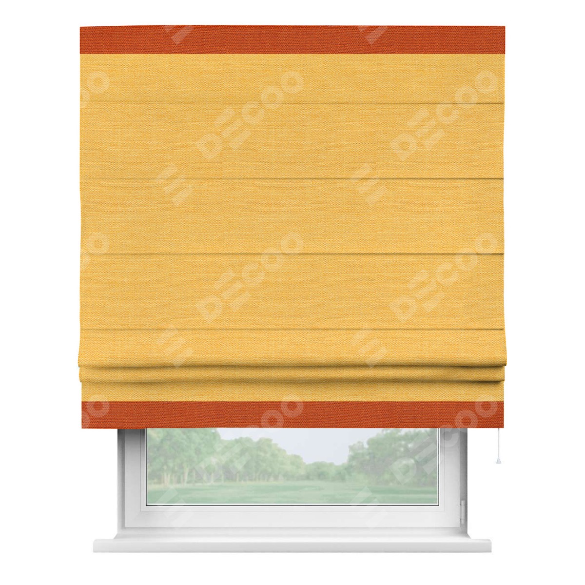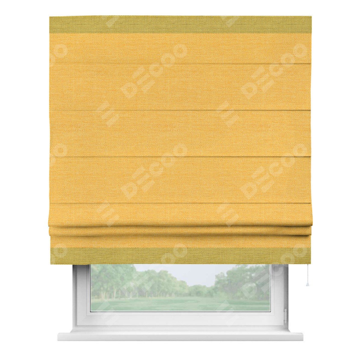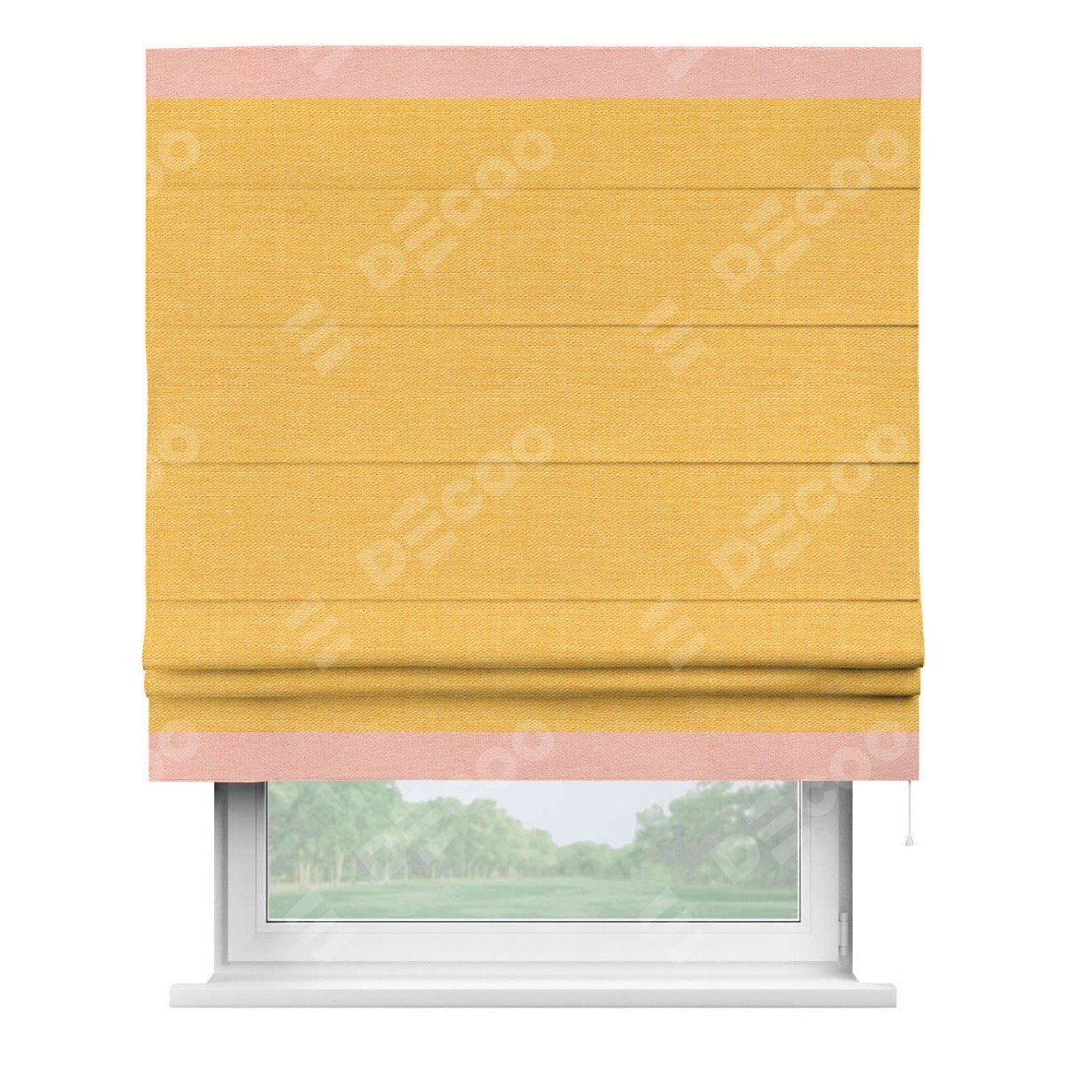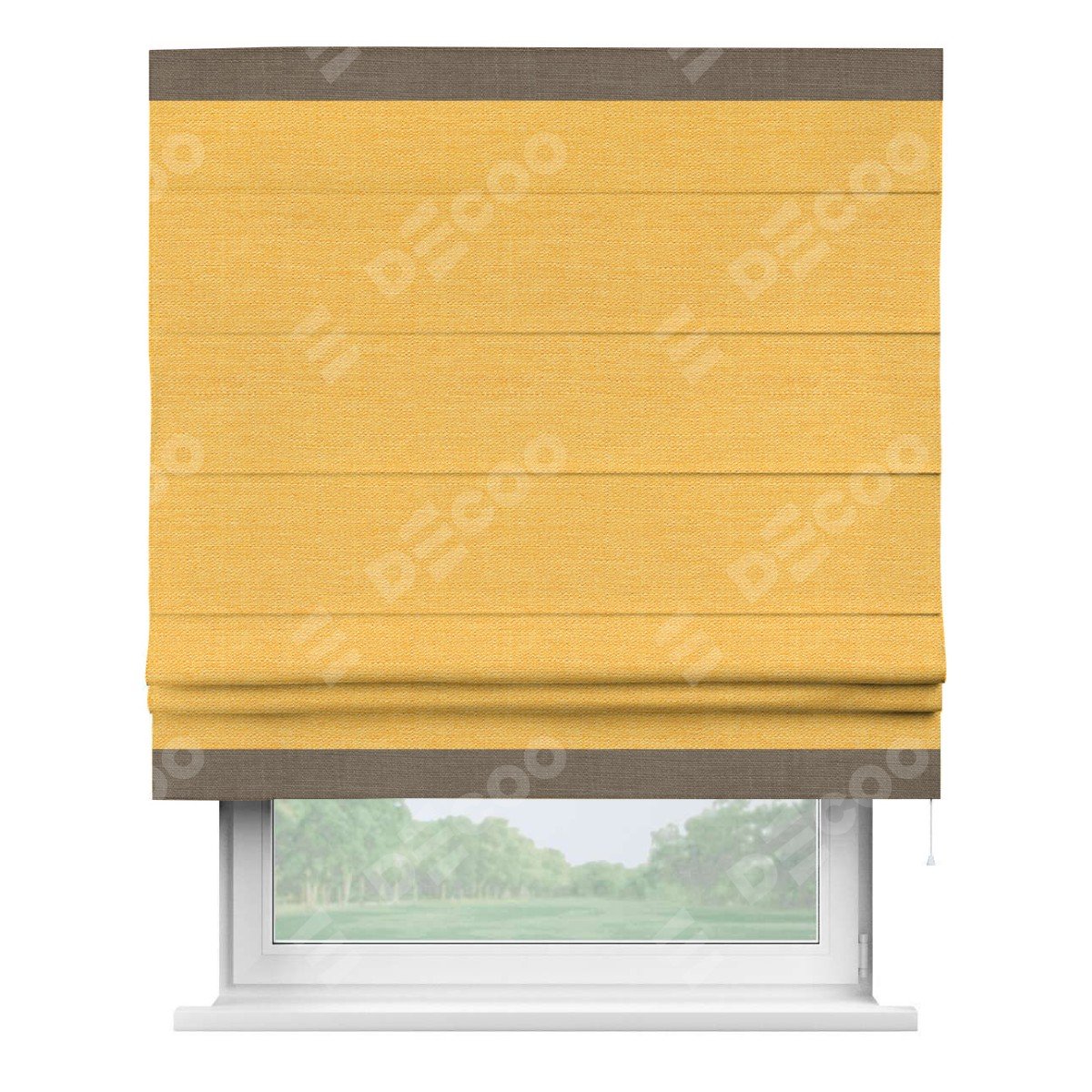 Римская штора производителя «Cortin», используется для проёма, пошита из ткани лён желтый, артикул 63738. Отделка шторы кантом «Горизонт», ткань для канта используется из льна разной расцветки на выбор. Имеет универсальный механизм и подходит для монтажа: на потолок, на стену и в нишу.