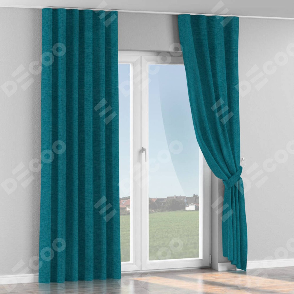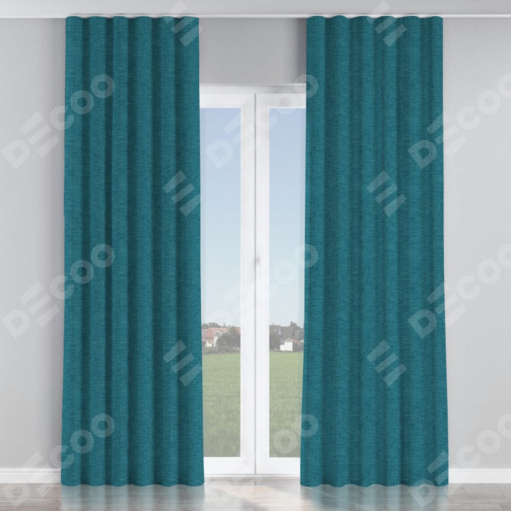 Комплект прямых штор, от производителя «Cortin», пошиты из ткани рогожка димаут синий, артикул ткани 80422. С изнаночной стороны в верхней части штор пристрачивается шторная лента с декоративными складками «Волна». Для создания элегантных складок прямые шторы шьются по стандарту с коэффициентом 1:2 (на 100 см. ширины проёма 200 см. ширины ткани).