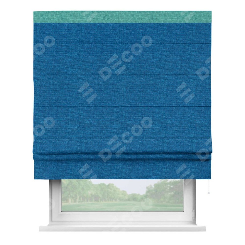 Римская штора производителя «Cortin», используется для проёма, пошита из ткани лён синий, артикул 63742. Отделка шторы кантом «Кинг», ткань для канта используется из льна разной расцветки на выбор. Имеет универсальный механизм и подходит для монтажа: на потолок, на стену и в нишу.