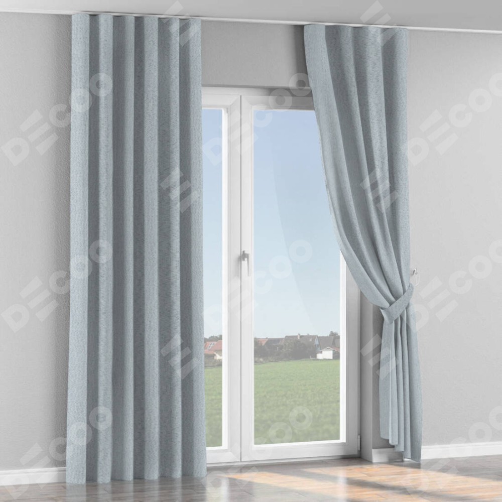 Комплект прямых штор, от производителя «Cortin», пошиты из ткани лён димаут серый, артикул ткани F3. С изнаночной стороны в верхней части штор пристрачивается шторная лента с декоративными складками «Волна». Для создания элегантных складок прямые шторы шьются по стандарту с коэффициентом 1:2 (на 100 см. ширины проёма 200 см. ширины ткани).