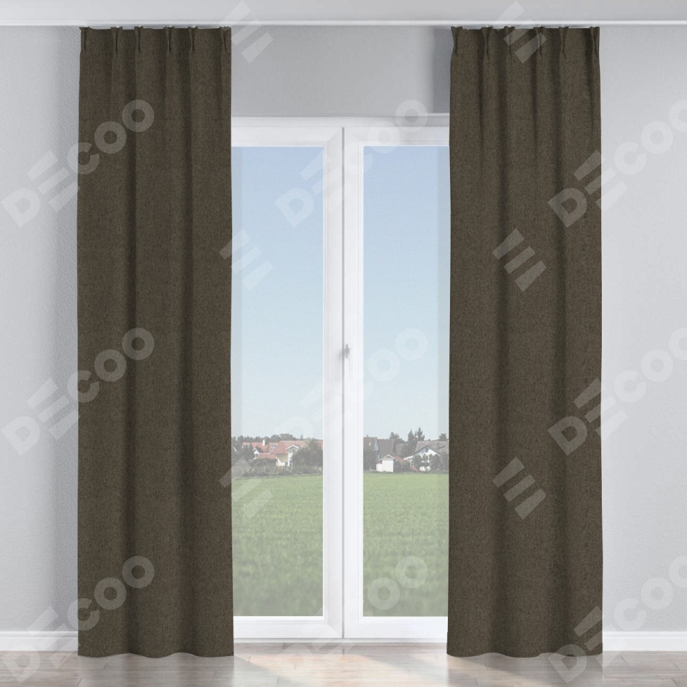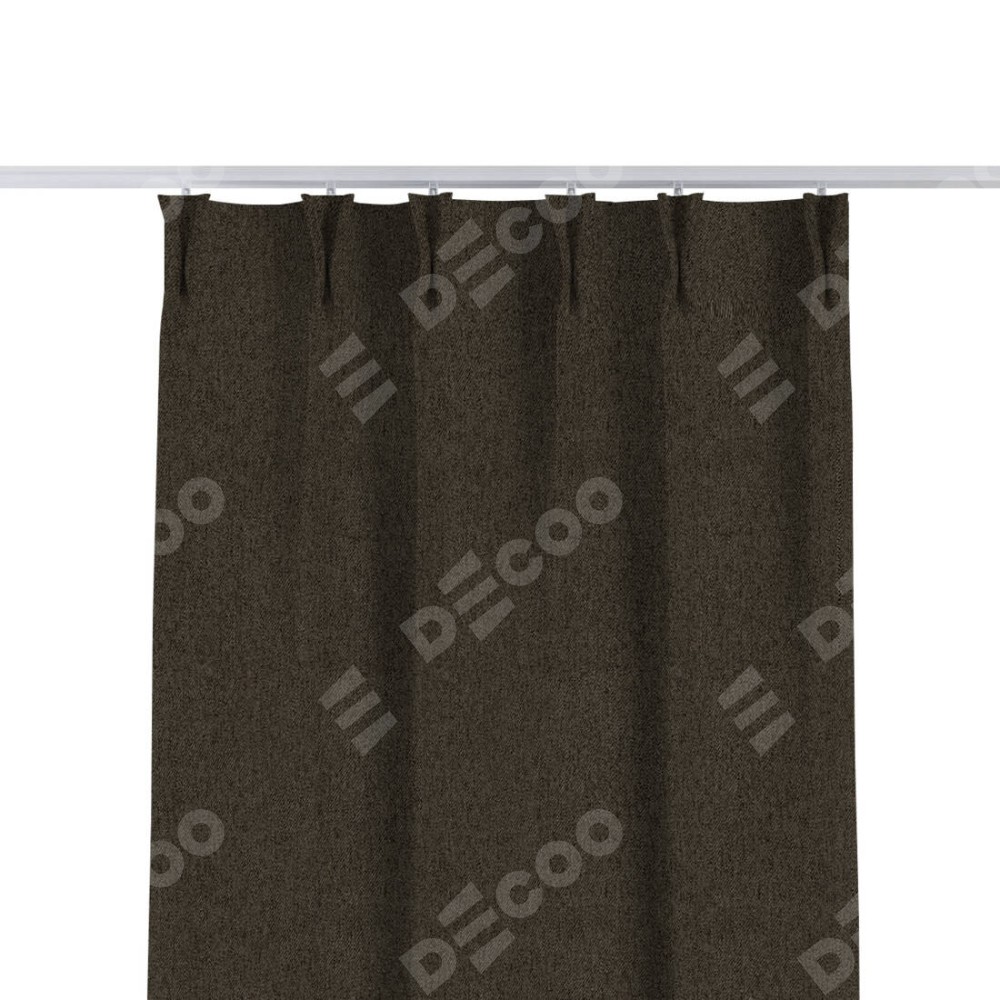Комплект прямых штор, от производителя «Cortin», пошиты из ткани твид блэкаут тёмно-коричневый, артикул ткани 21584. С изнаночной стороны в верхней части штор пристрачивается шторная лента с декоративными складками «Кустик». Для создания элегантных складок прямые шторы шьются по стандарту с коэффициентом 1:2 (на 100 см. ширины проёма 200 см. ширины ткани).