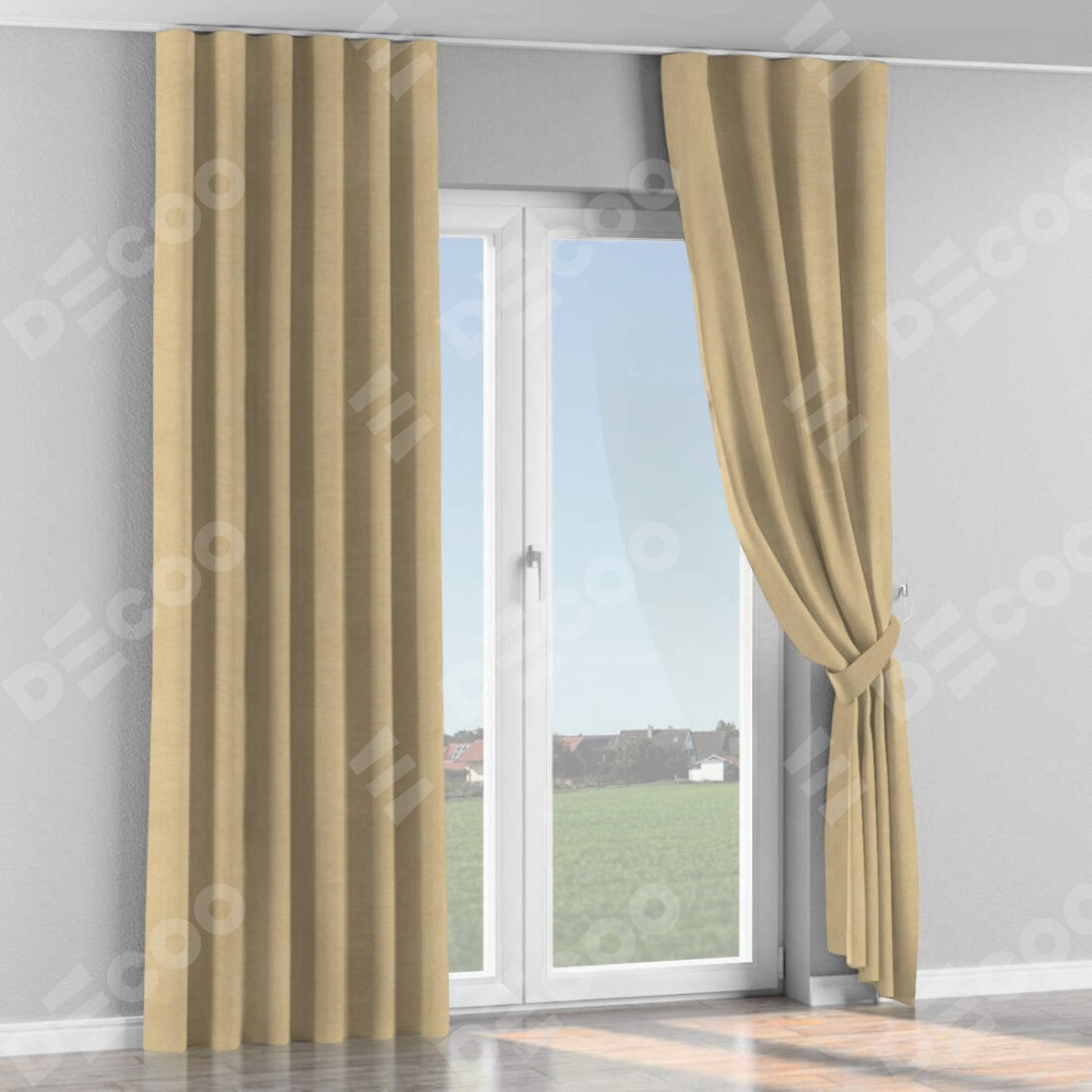 Комплект прямых штор, от производителя «Cortin», пошиты из ткани вельвет бежевый, артикул ткани 85538. С изнаночной стороны в верхней части штор пристрачивается шторная лента с декоративными складками «Волна». Для создания элегантных складок прямые шторы шьются по стандарту с коэффициентом 1:2 (на 100 см. ширины проёма 200 см. ширины ткани).