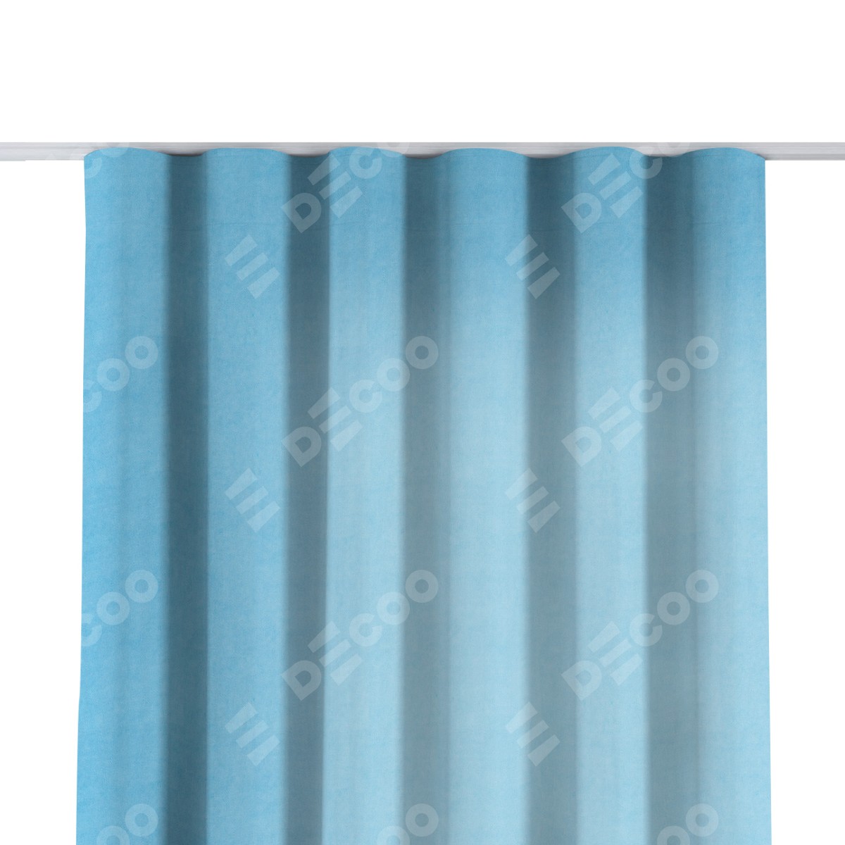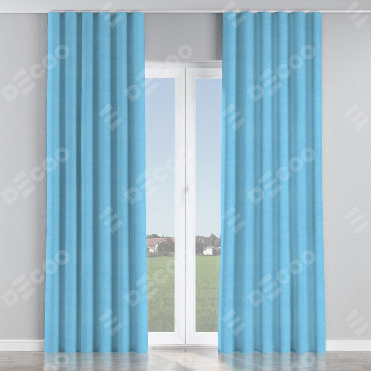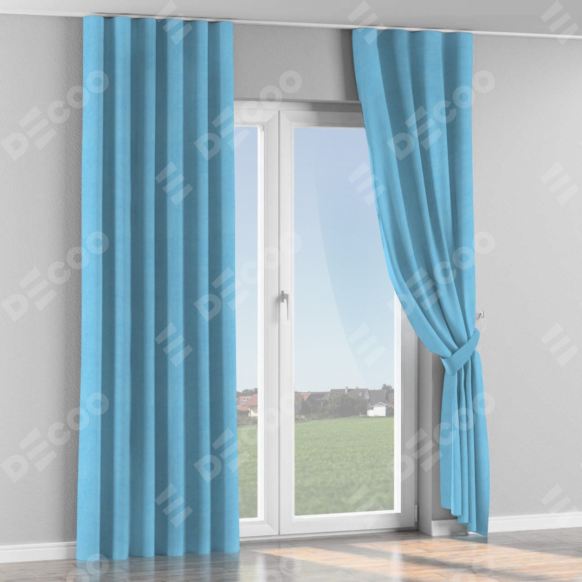 Комплект прямых штор, от производителя «Cortin», пошиты из ткани вельвет голубой, артикул ткани 85544. С изнаночной стороны в верхней части штор пристрачивается шторная лента с декоративными складками «Волна». Для создания элегантных складок прямые шторы шьются по стандарту с коэффициентом 1:2 (на 100 см. ширины проёма 200 см. ширины ткани).