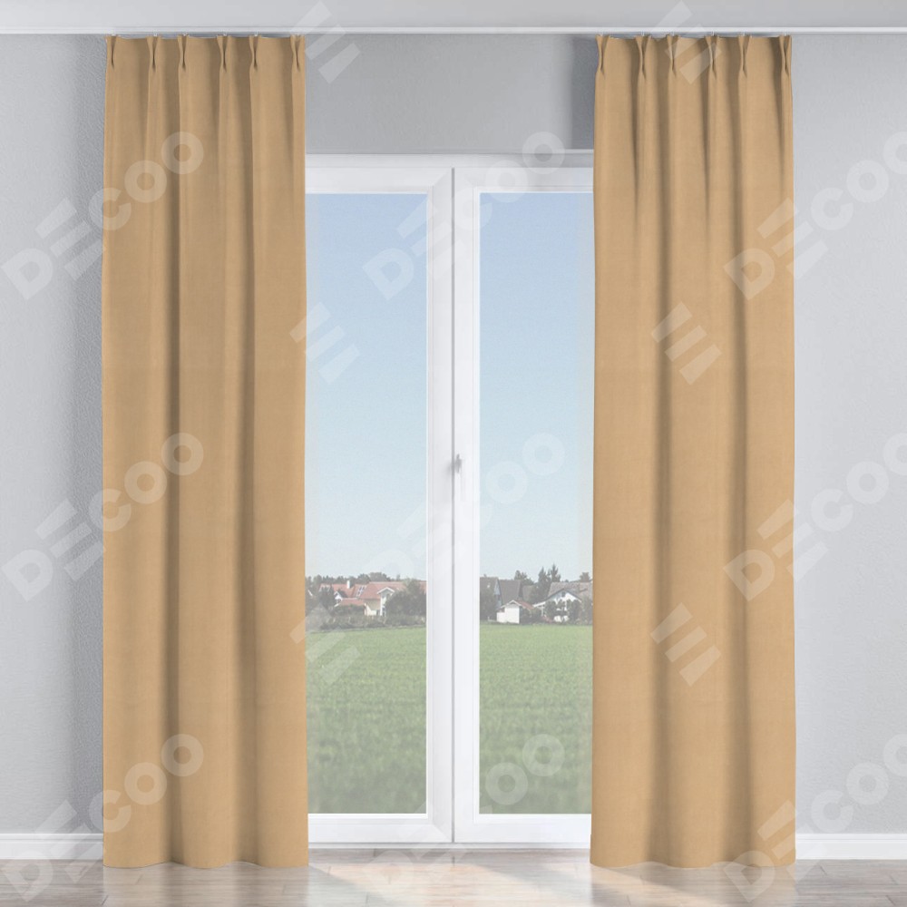 Комплект прямых штор, от производителя «Cortin», пошиты из ткани вельвет песочный, артикул ткани 17740. С изнаночной стороны в верхней части штор пристрачивается шторная лента с декоративными складками «Кустик». Для создания элегантных складок прямые шторы шьются по стандарту с коэффициентом 1:2 (на 100 см. ширины проёма 200 см. ширины ткани).