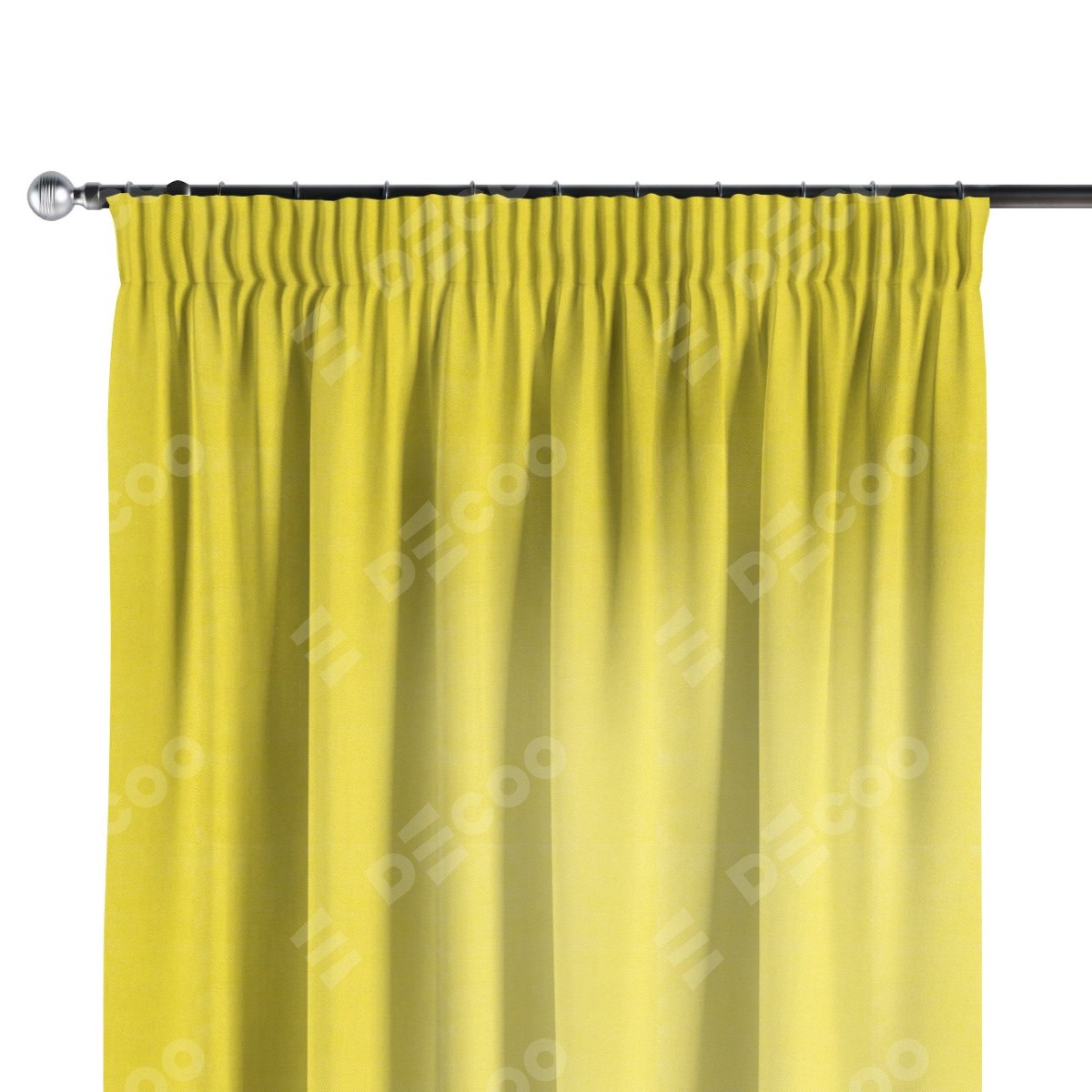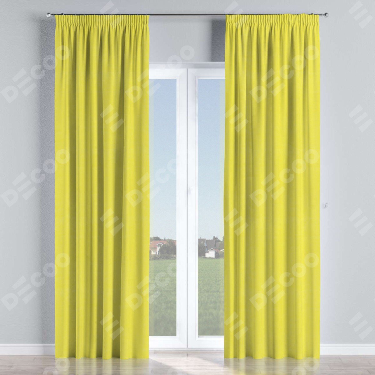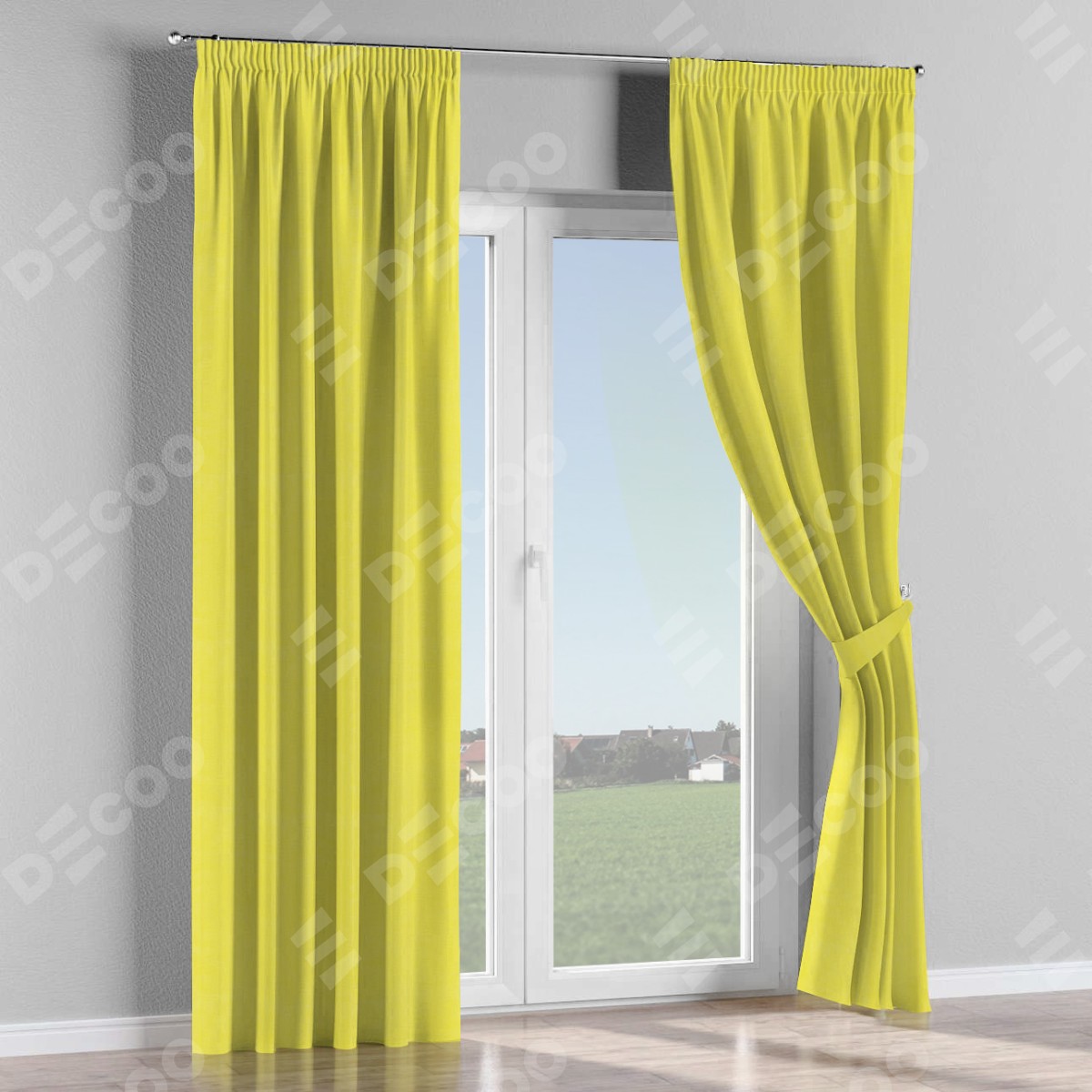 Комплект прямых штор, от производителя «Cortin», пошиты из ткани вельвет светло-желтый, артикул ткани 30997. С изнаночной стороны в верхней части штор пристрачивается шторная лента с декоративными складками «Карандаш». Для создания элегантных складок прямые шторы шьются по стандарту с коэффициентом 1:2 (на 100 см. ширины проёма 200 см. ширины ткани).