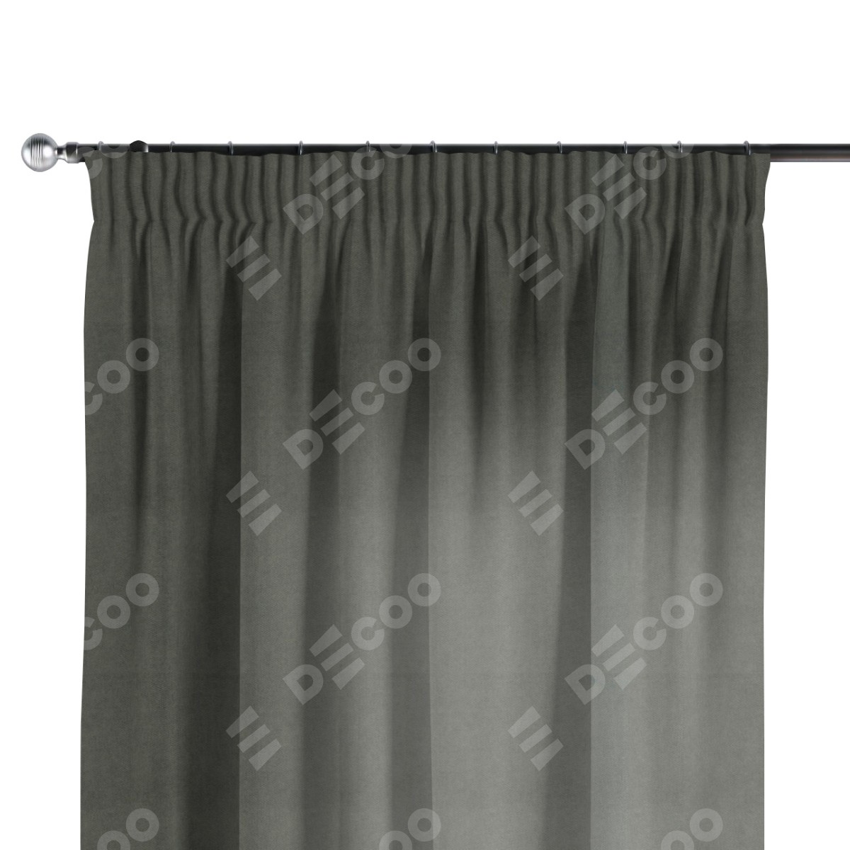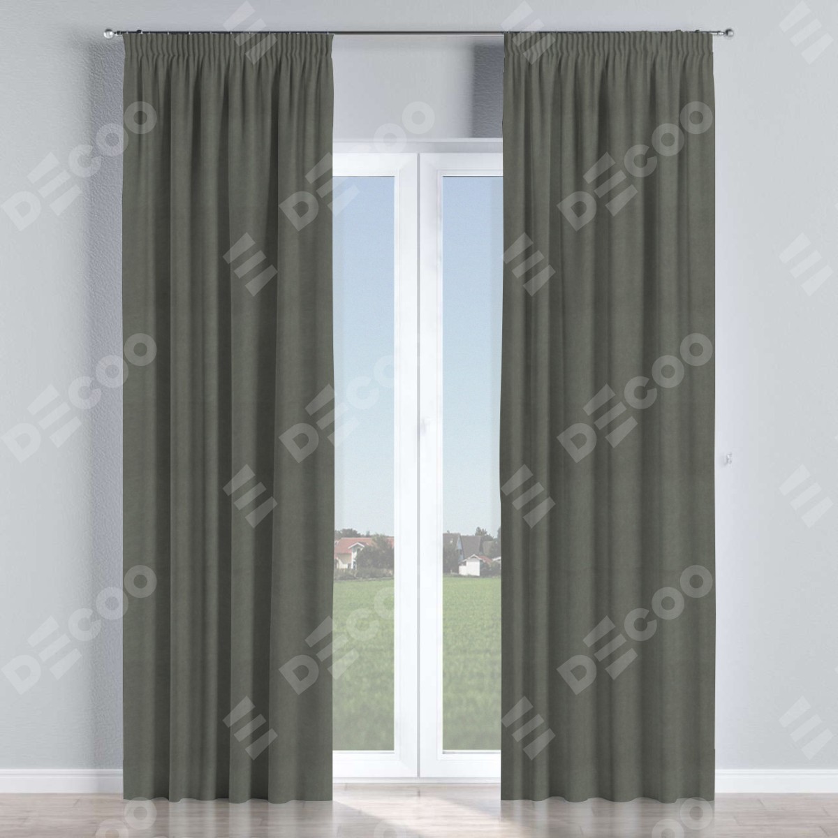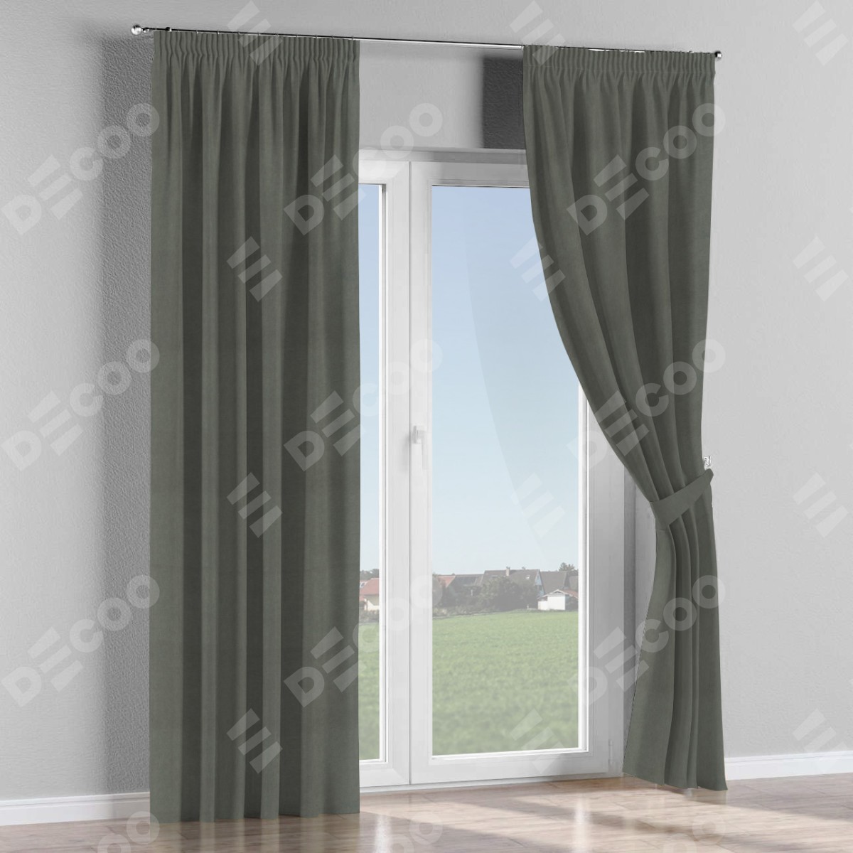 Комплект прямых штор, от производителя «Cortin», пошиты из ткани вельвет тёмно-серый, артикул ткани 85542. С изнаночной стороны в верхней части штор пристрачивается шторная лента с декоративными складками «Карандаш». Для создания элегантных складок прямые шторы шьются по стандарту с коэффициентом 1:2 (на 100 см. ширины проёма 200 см. ширины ткани).