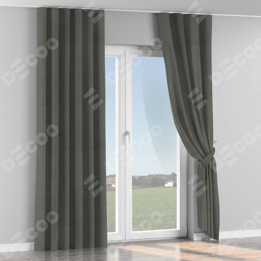 Комплект прямых штор, от производителя «Cortin», пошиты из ткани вельвет тёмно-серый, артикул ткани 85542. С изнаночной стороны в верхней части штор пристрачивается шторная лента с декоративными складками «Волна». Для создания элегантных складок прямые шторы шьются по стандарту с коэффициентом 1:2 (на 100 см. ширины проёма 200 см. ширины ткани).