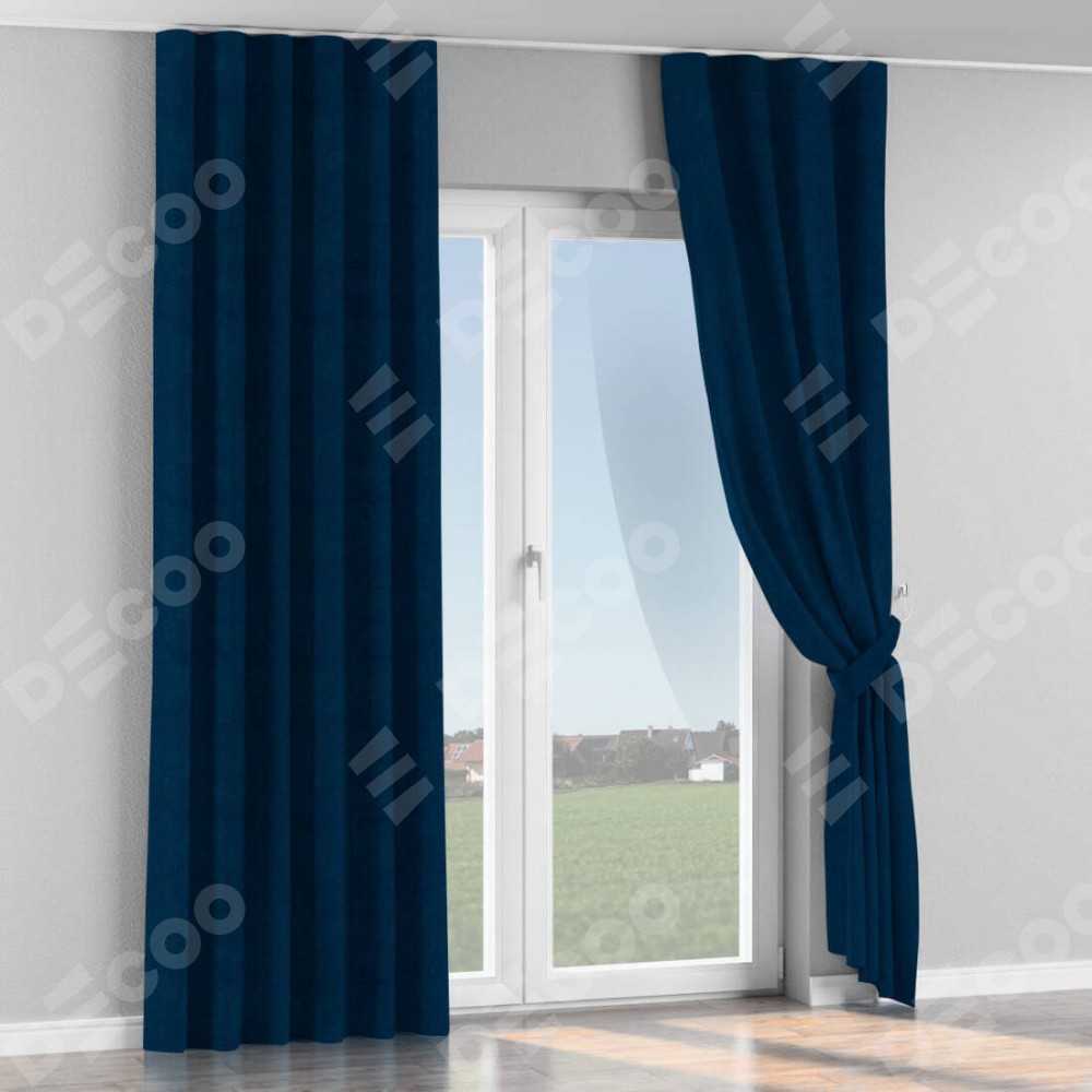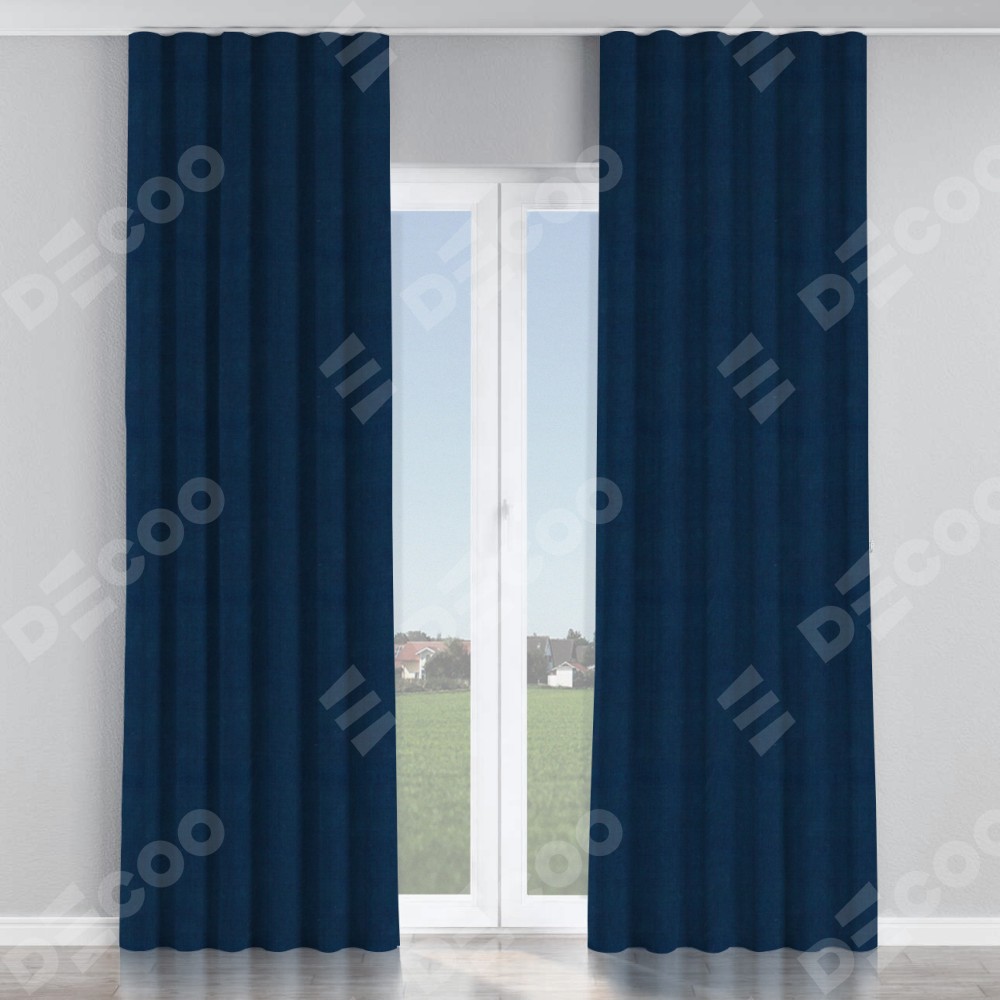 Комплект прямых штор, от производителя «Cortin», пошиты из ткани вельвет тёмно-синий, артикул ткани 14152. С изнаночной стороны в верхней части штор пристрачивается шторная лента с декоративными складками «Волна». Для создания элегантных складок прямые шторы шьются по стандарту с коэффициентом 1:2 (на 100 см. ширины проёма 200 см. ширины ткани).