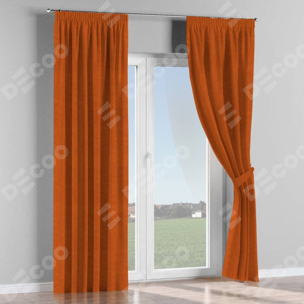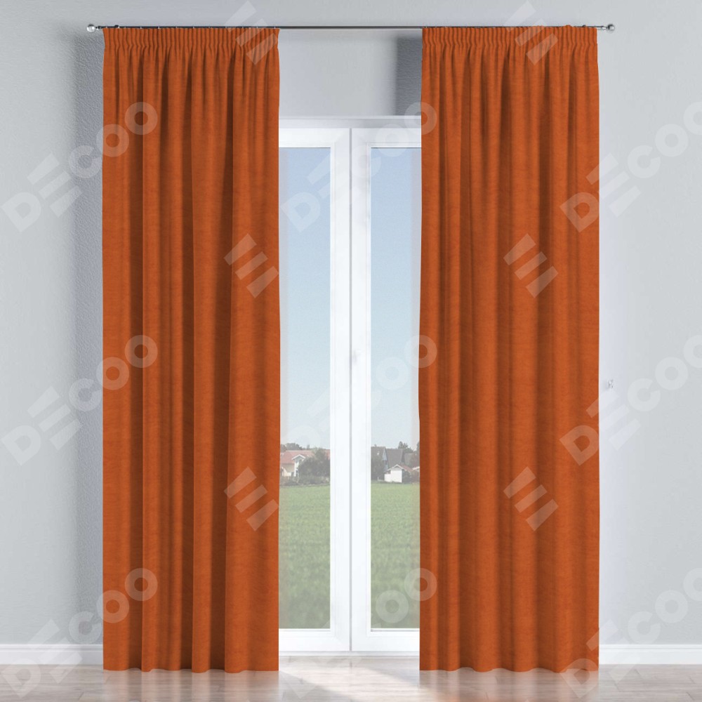 Комплект прямых штор, от производителя «Cortin», пошиты из ткани вельвет терракотовый, артикул ткани 85548. С изнаночной стороны в верхней части штор пристрачивается шторная лента с декоративными складками «Карандаш». Для создания элегантных складок прямые шторы шьются по стандарту с коэффициентом 1:2 (на 100 см. ширины проёма 200 см. ширины ткани).
