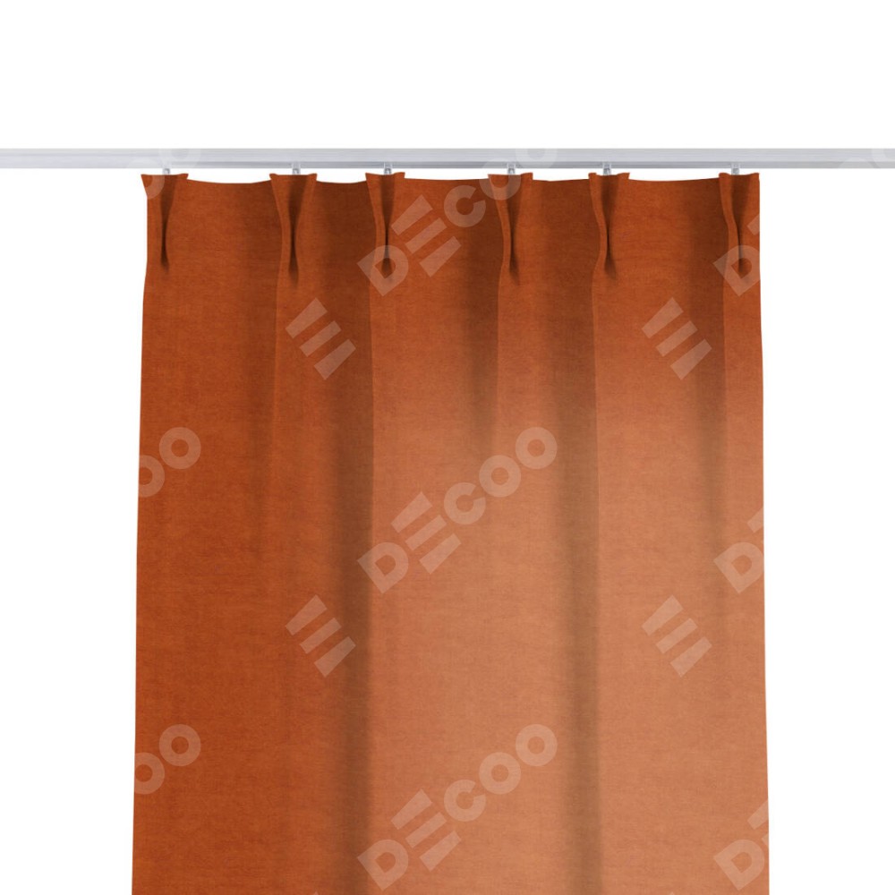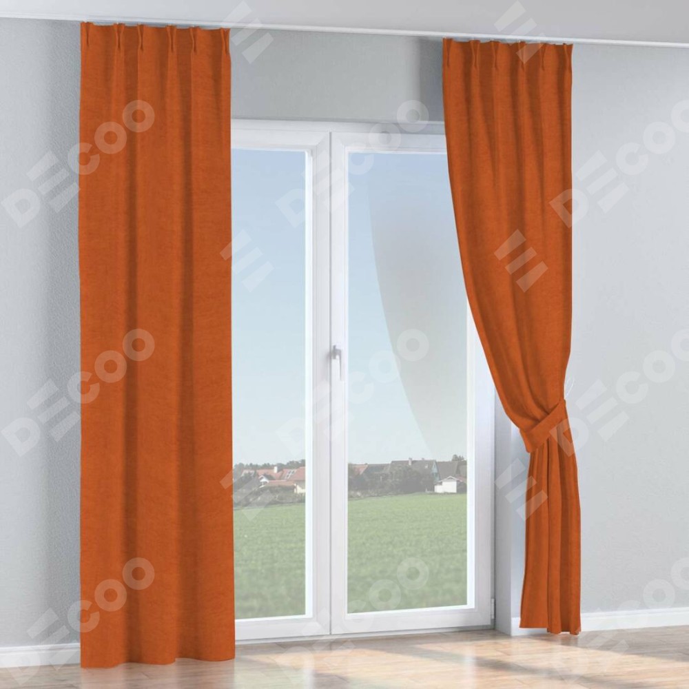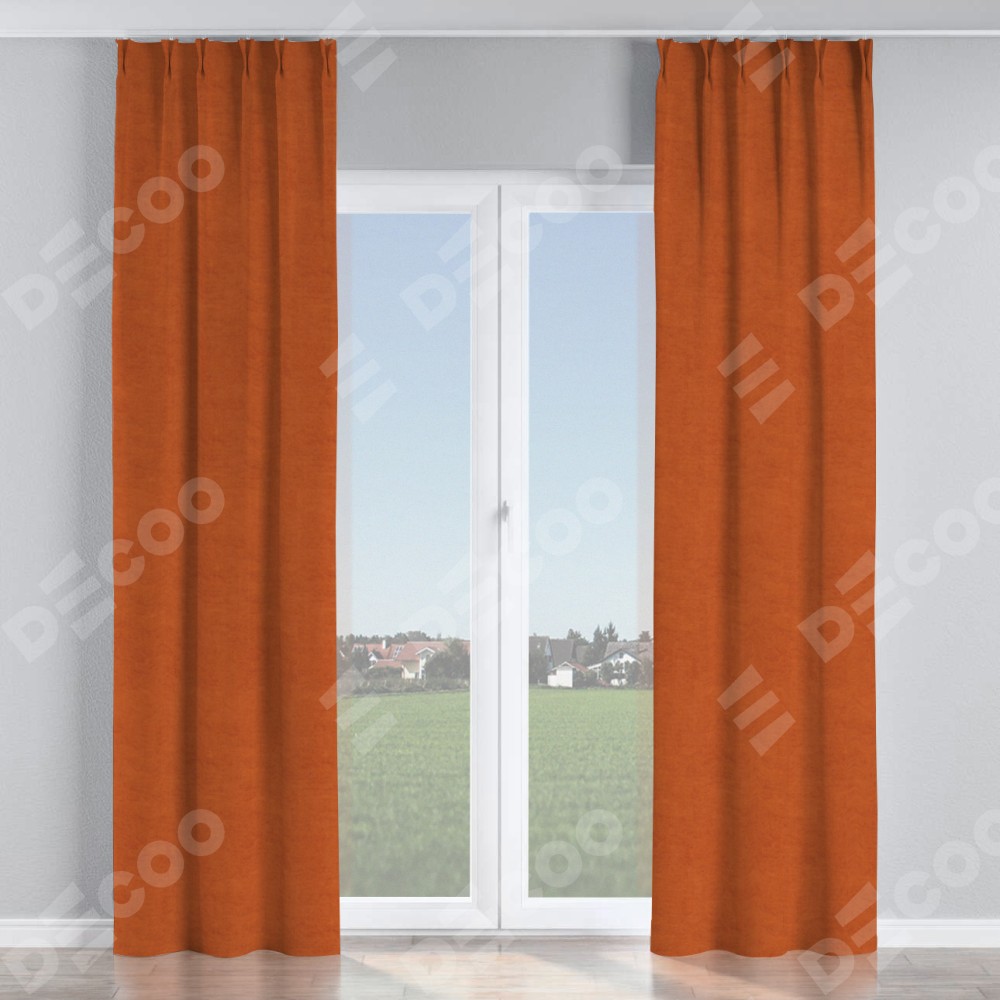 Комплект прямых штор, от производителя «Cortin», пошиты из ткани вельвет терракотовый, артикул ткани 85548. С изнаночной стороны в верхней части штор пристрачивается шторная лента с декоративными складками «Кустик». Для создания элегантных складок прямые шторы шьются по стандарту с коэффициентом 1:2 (на 100 см. ширины проёма 200 см. ширины ткани).