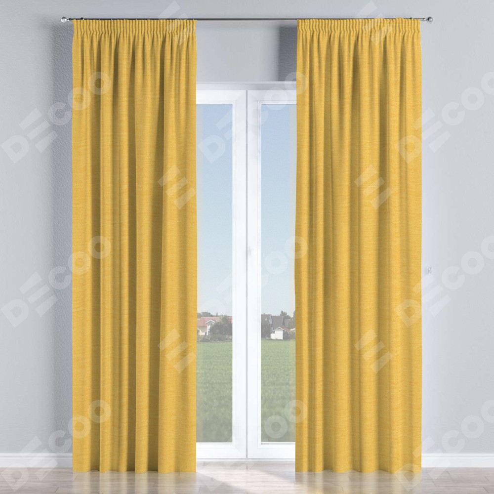 Комплект прямых штор, от производителя «Cortin», пошиты из ткани лён желтый, артикул ткани 63738. С изнаночной стороны в верхней части штор пристрачивается шторная лента с декоративными складками «Карандаш». Для создания элегантных складок прямые шторы шьются по стандарту с коэффициентом 1:2 (на 100 см. ширины проёма 200 см. ширины ткани).