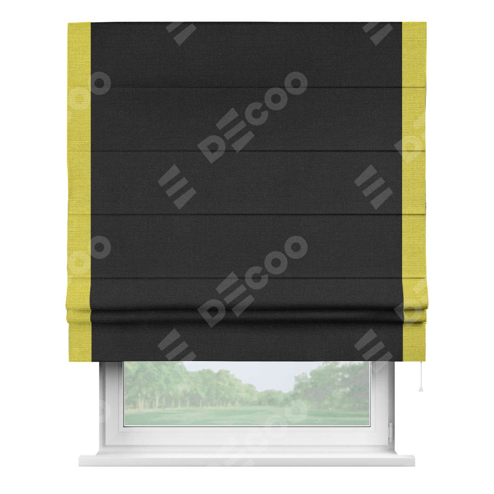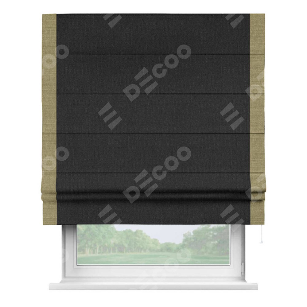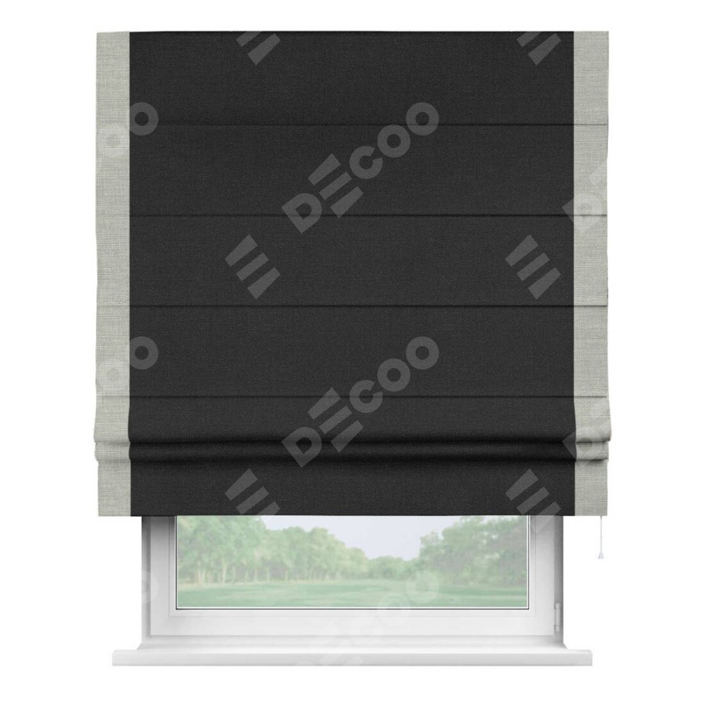 Римская штора производителя «Cortin», используется для проёма, пошита из ткани лён черный, артикул 85927. Отделка шторы кантом Стрим Дуо», ткань для канта используется из льна разной расцветки на выбор. Имеет универсальный механизм и подходит для монтажа: на потолок, на стену и в нишу.