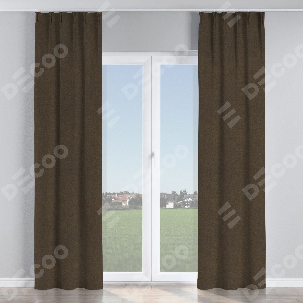 Комплект прямых штор, от производителя «Cortin», пошиты из ткани лён тёмно-коричневый, артикул ткани 53444. С изнаночной стороны в верхней части штор пристрачивается шторная лента с декоративными складками «Кустик». Для создания элегантных складок прямые шторы шьются по стандарту с коэффициентом 1:2 (на 100 см. ширины проёма 200 см. ширины ткани).