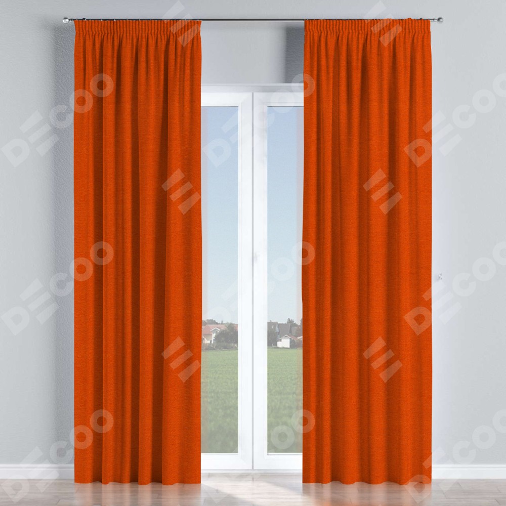 Комплект прямых штор, от производителя «Cortin», пошиты из ткани лён терракотовый, артикул ткани 53440. С изнаночной стороны в верхней части штор пристрачивается шторная лента с декоративными складками «Карандаш». Для создания элегантных складок прямые шторы шьются по стандарту с коэффициентом 1:2 (на 100 см. ширины проёма 200 см. ширины ткани).