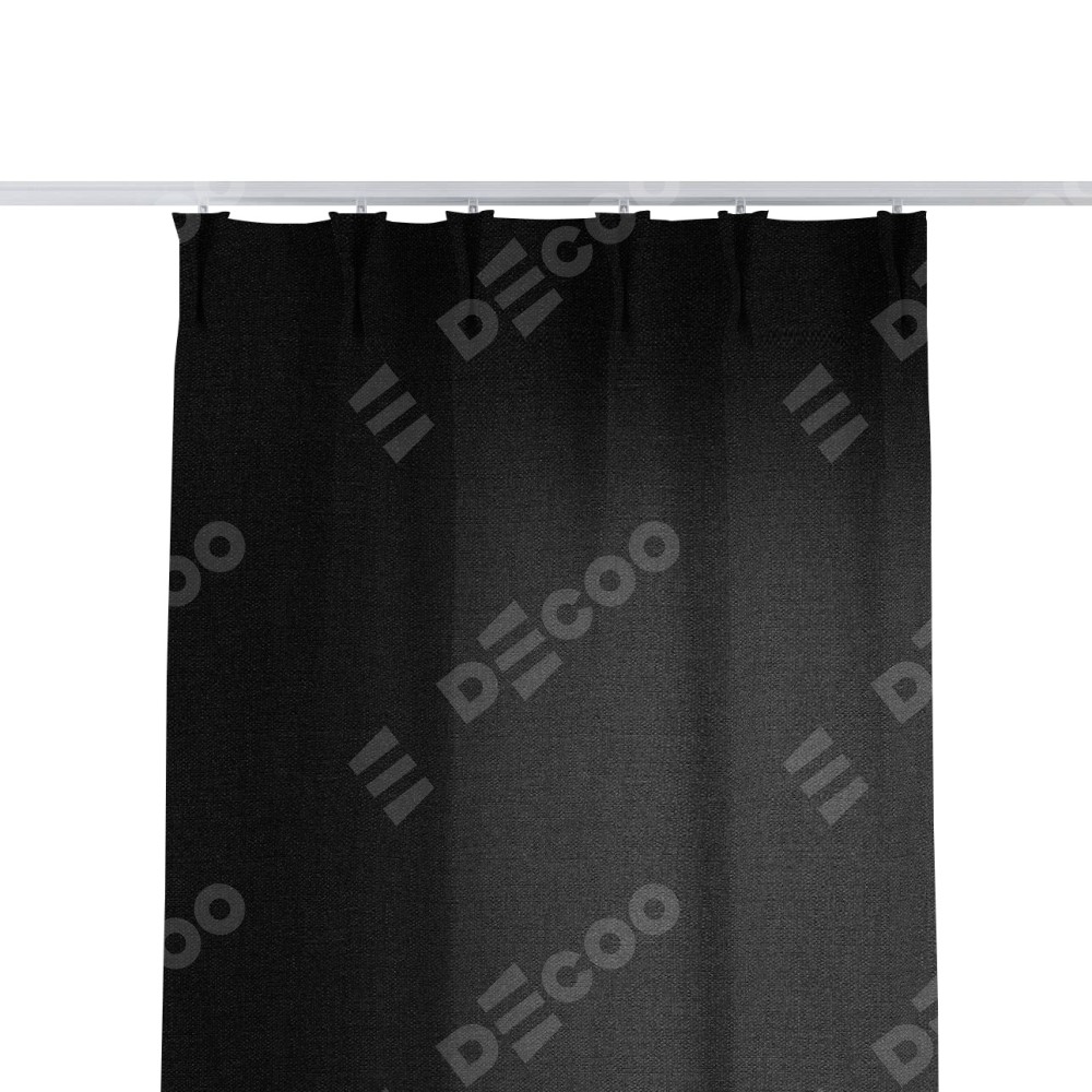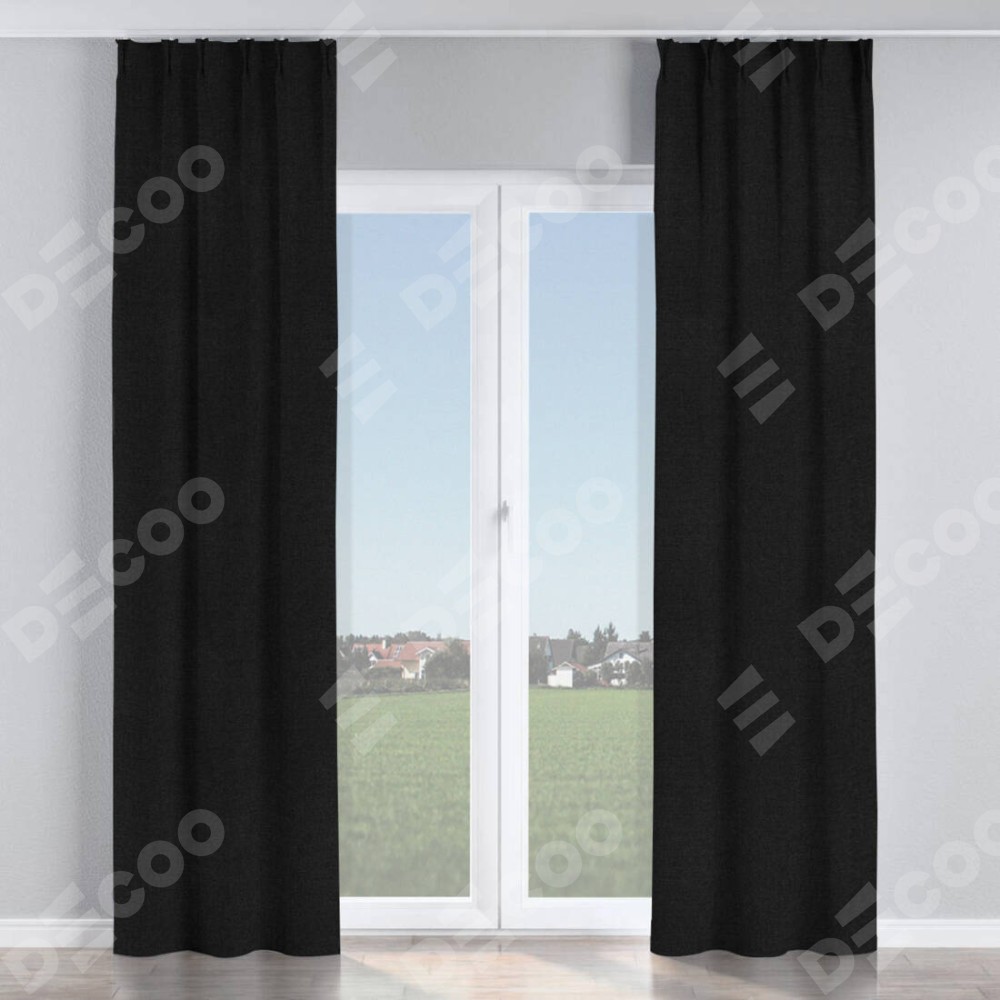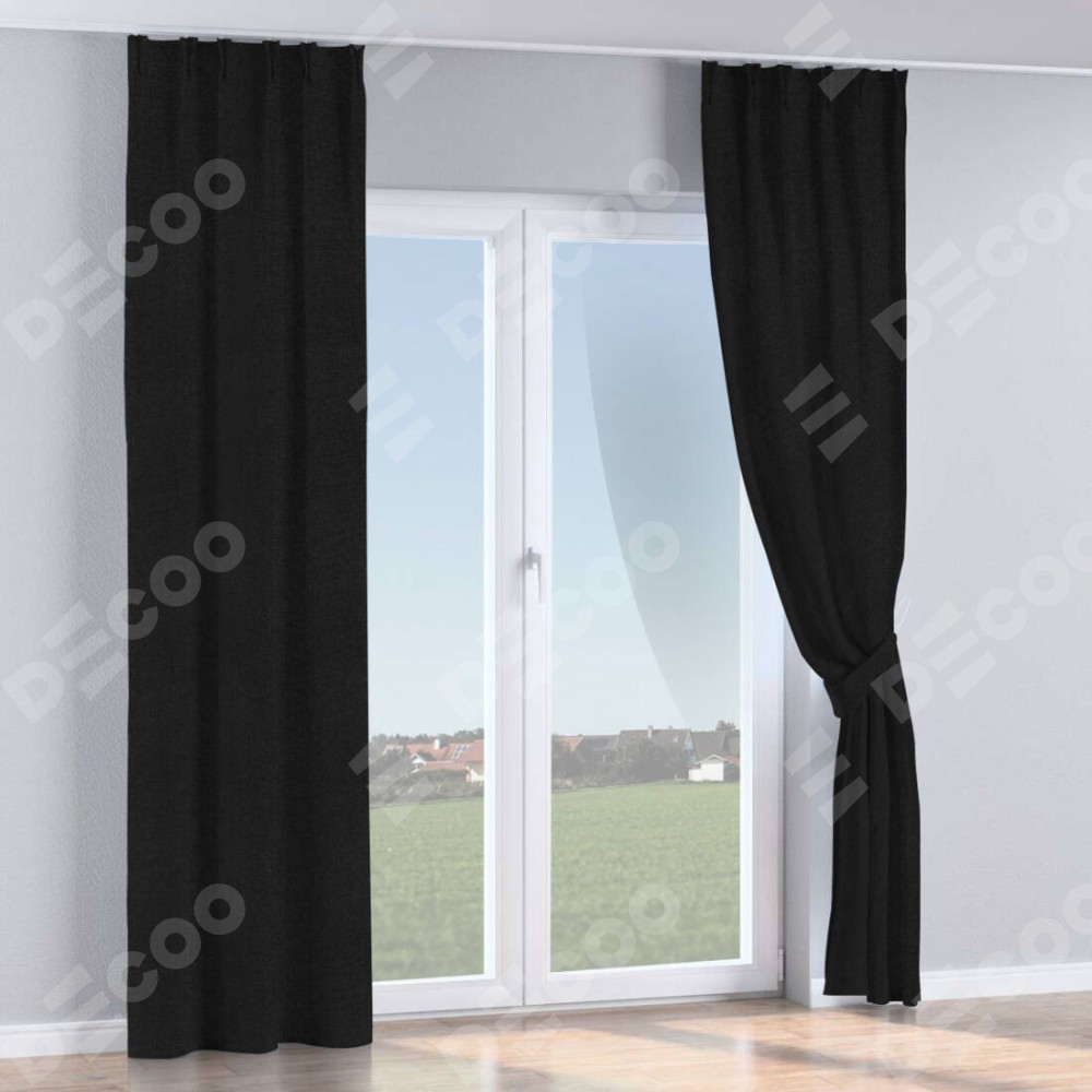 Комплект прямых штор, от производителя «Cortin», пошиты из ткани лён черный, артикул ткани 85927. С изнаночной стороны в верхней части штор пристрачивается шторная лента с декоративными складками «Кустик». Для создания элегантных складок прямые шторы шьются по стандарту с коэффициентом 1:2 (на 100 см. ширины проёма 200 см. ширины ткани).
