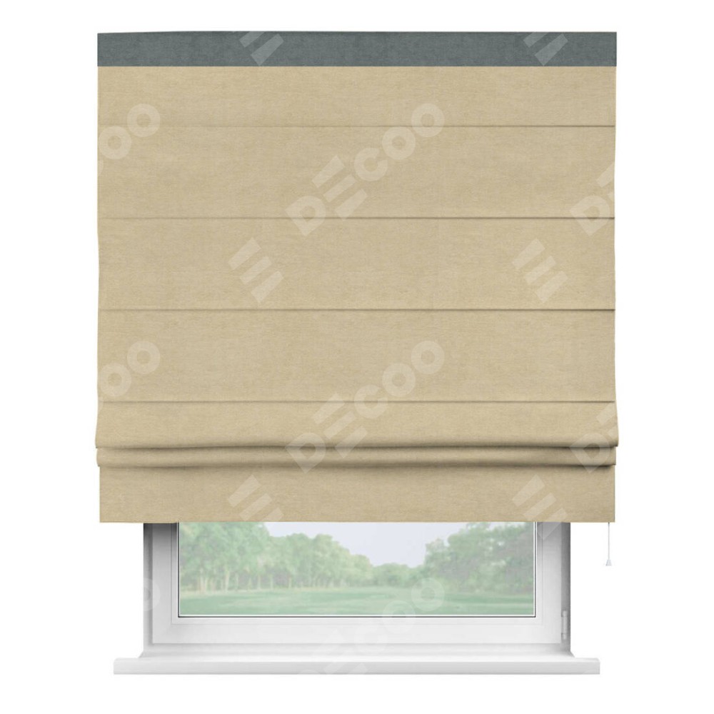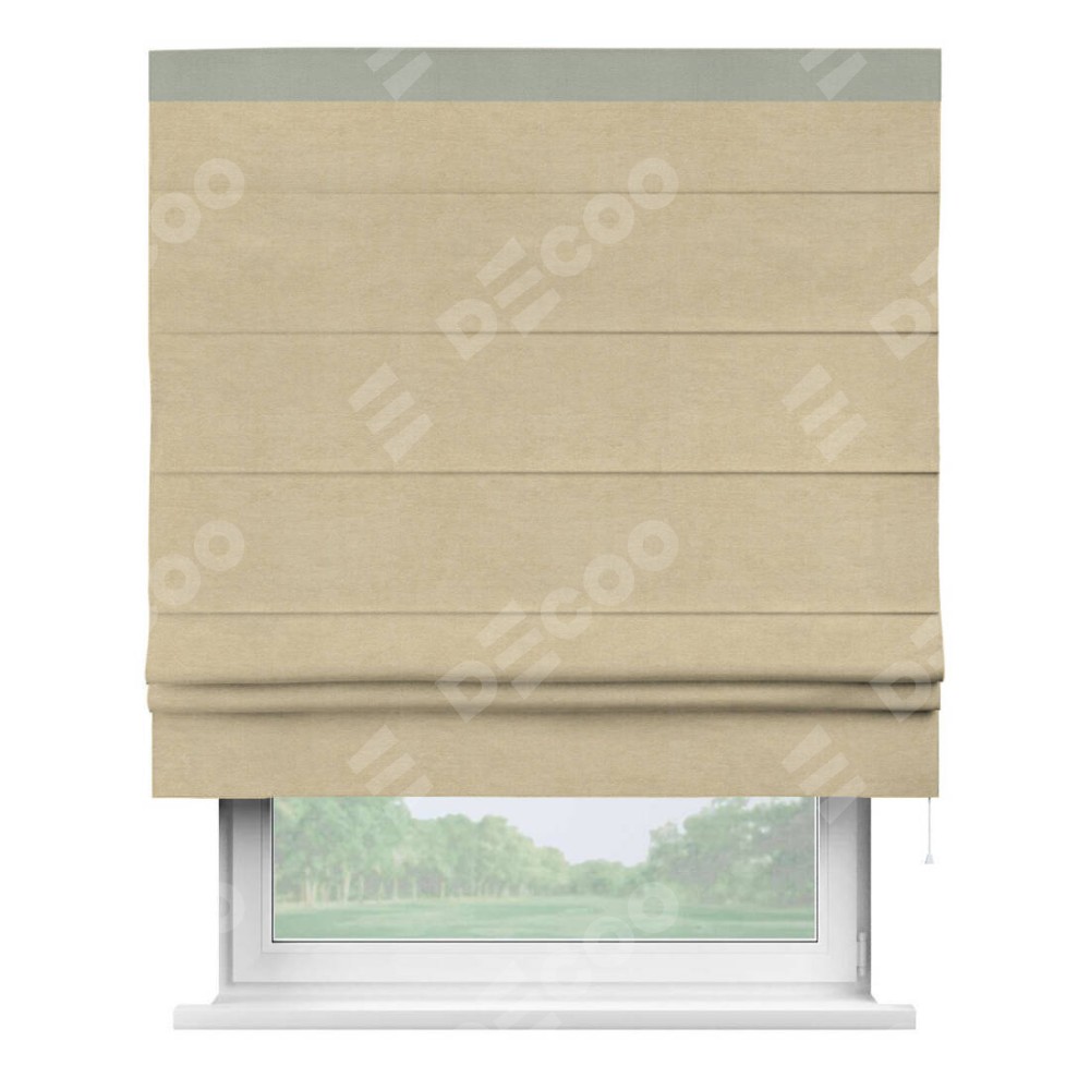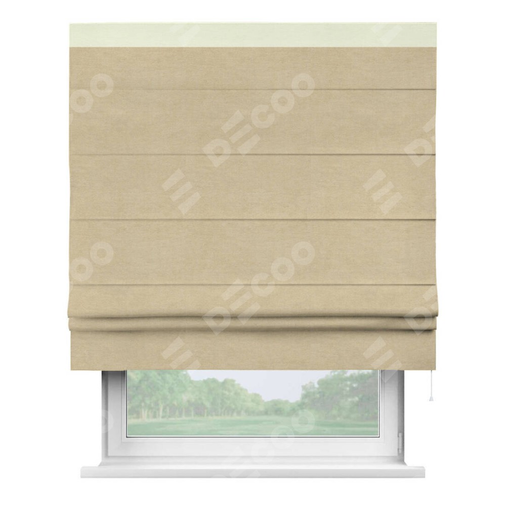 Римская штора производителя «Cortin», используется для проёма, пошита из ткани вельвет бежевый, артикул ткани 85538. Отделка шторы кантом «Кинг», ткань для канта используется из вельвета разной расцветки на выбор. Имеет универсальный механизм и подходит для монтажа: на потолок, на стену и в нишу.