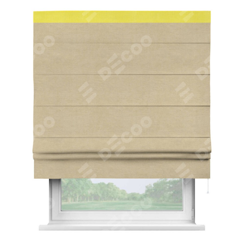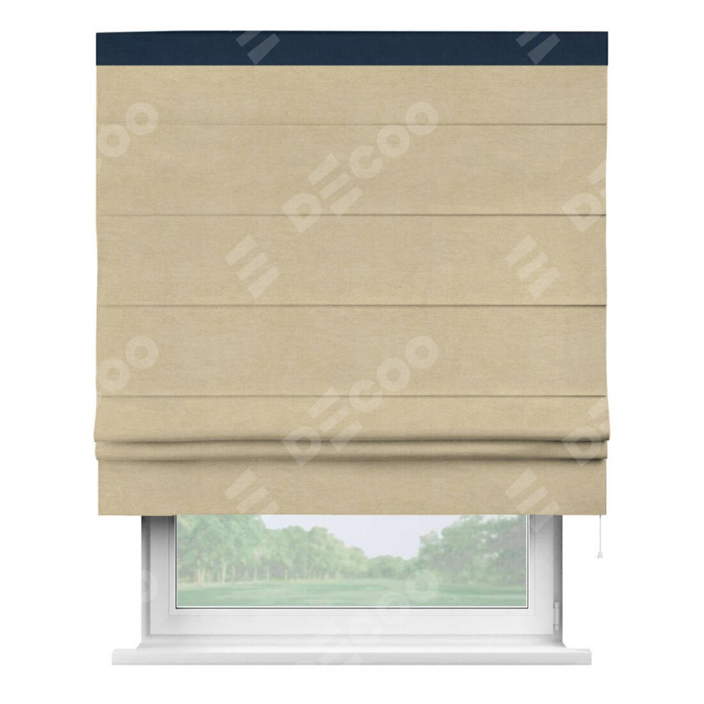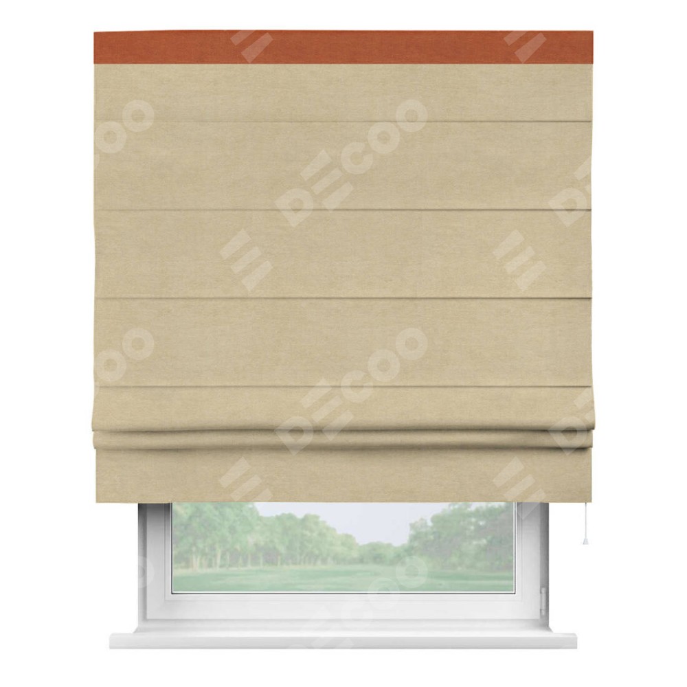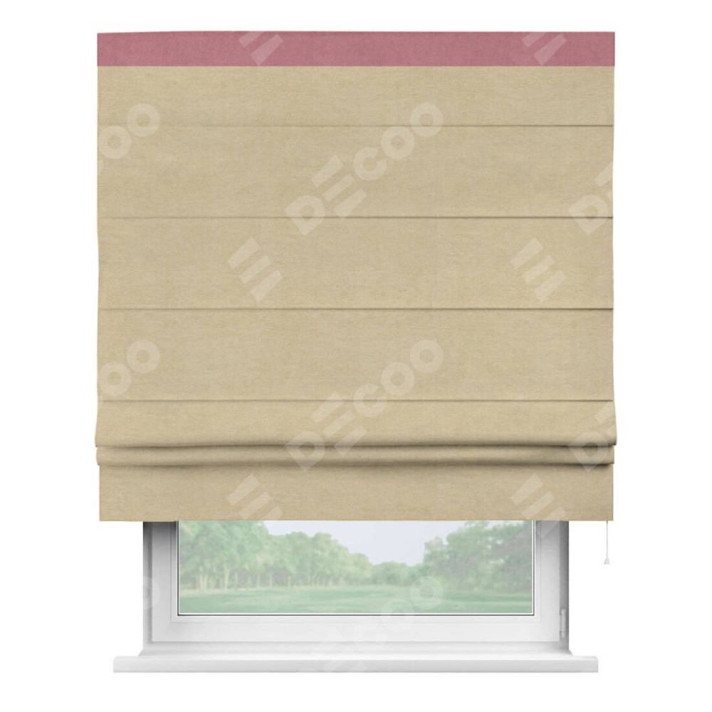 Римская штора производителя «Cortin», используется для проёма, пошита из ткани вельвет бежевый, артикул ткани 85538. Отделка шторы кантом «Кинг», ткань для канта используется из вельвета разной расцветки на выбор. Имеет универсальный механизм и подходит для монтажа: на потолок, на стену и в нишу.