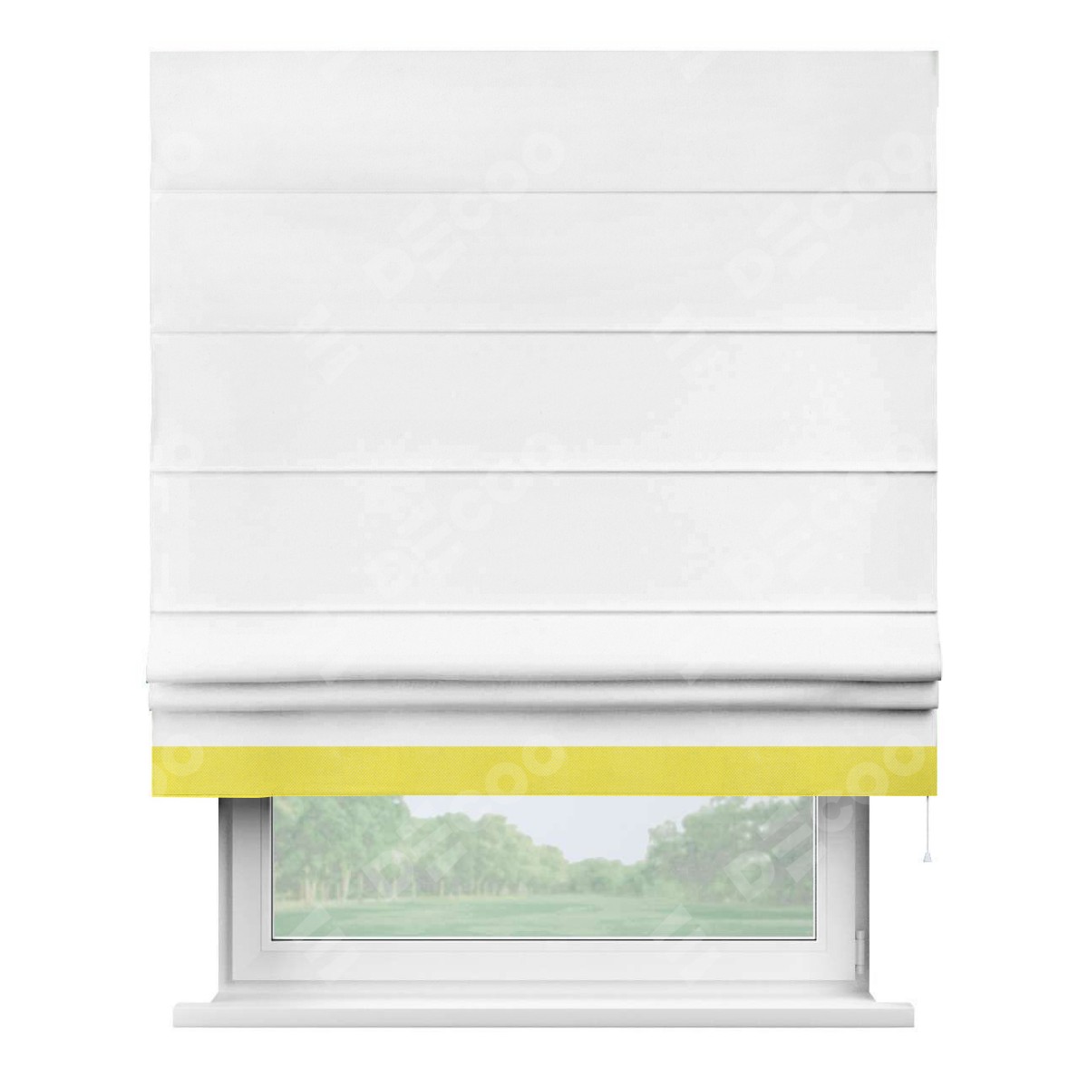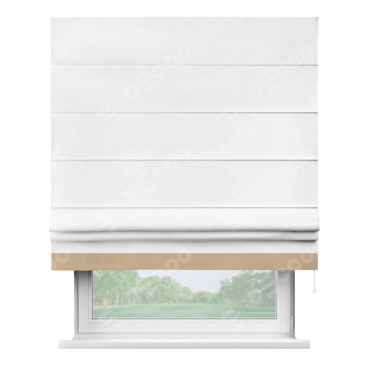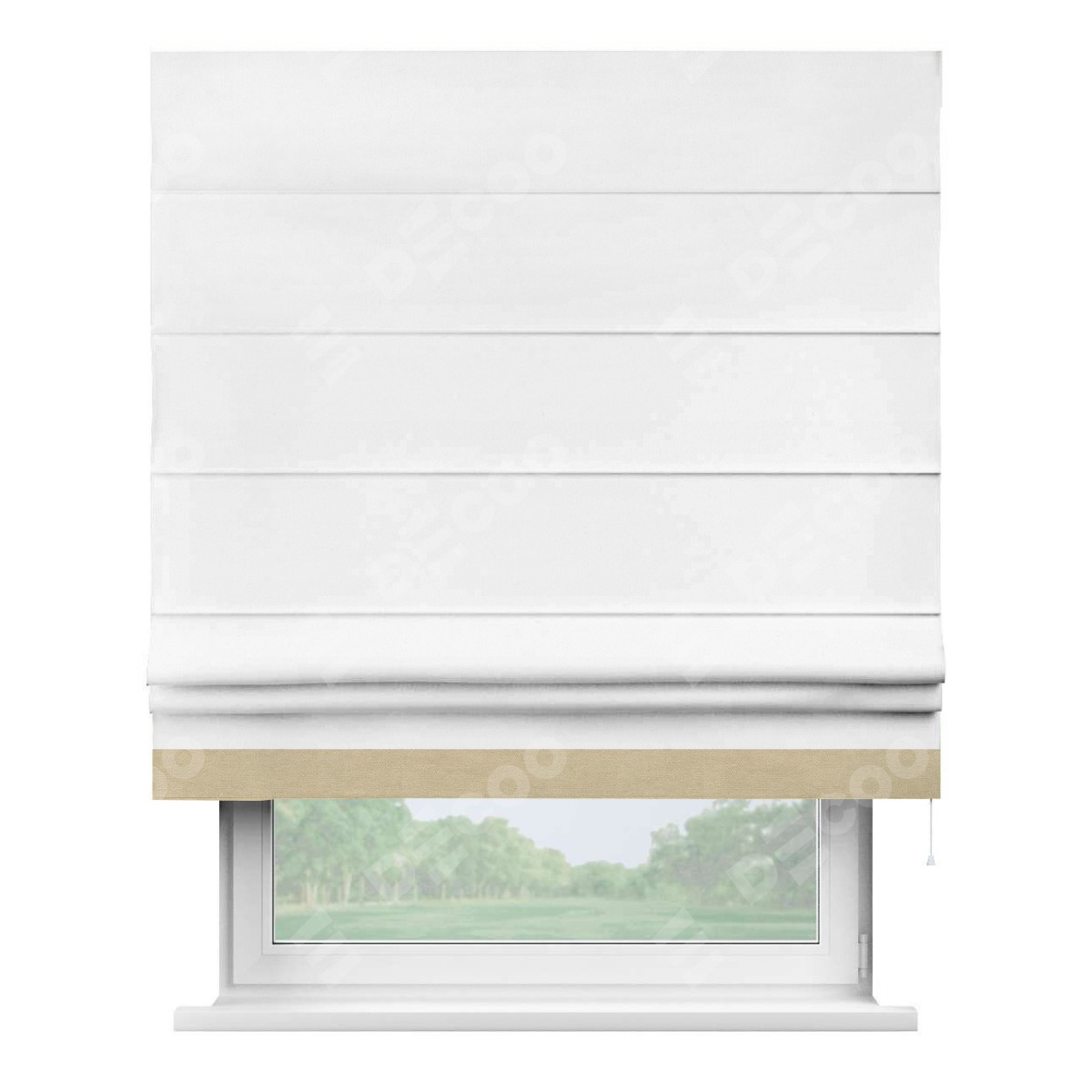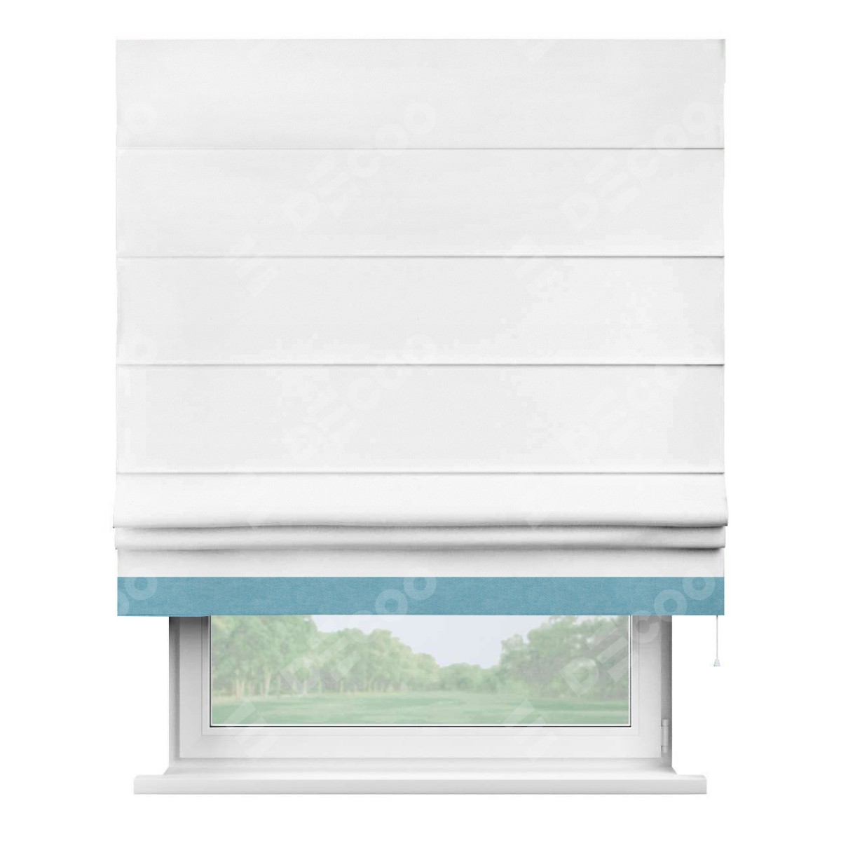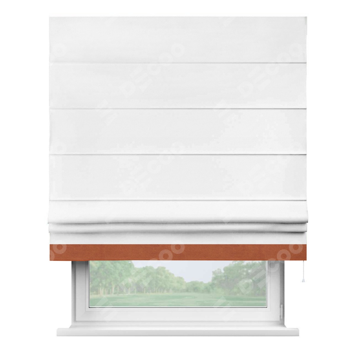 Римская штора производителя «Cortin», используется для проёма, пошита из ткани вельвет белый, артикул ткани 10810. Отделка шторы кантом «Джестер», ткань для канта используется из вельвета разной расцветки на выбор. Имеет универсальный механизм и подходит для монтажа: на потолок, на стену и в нишу.
