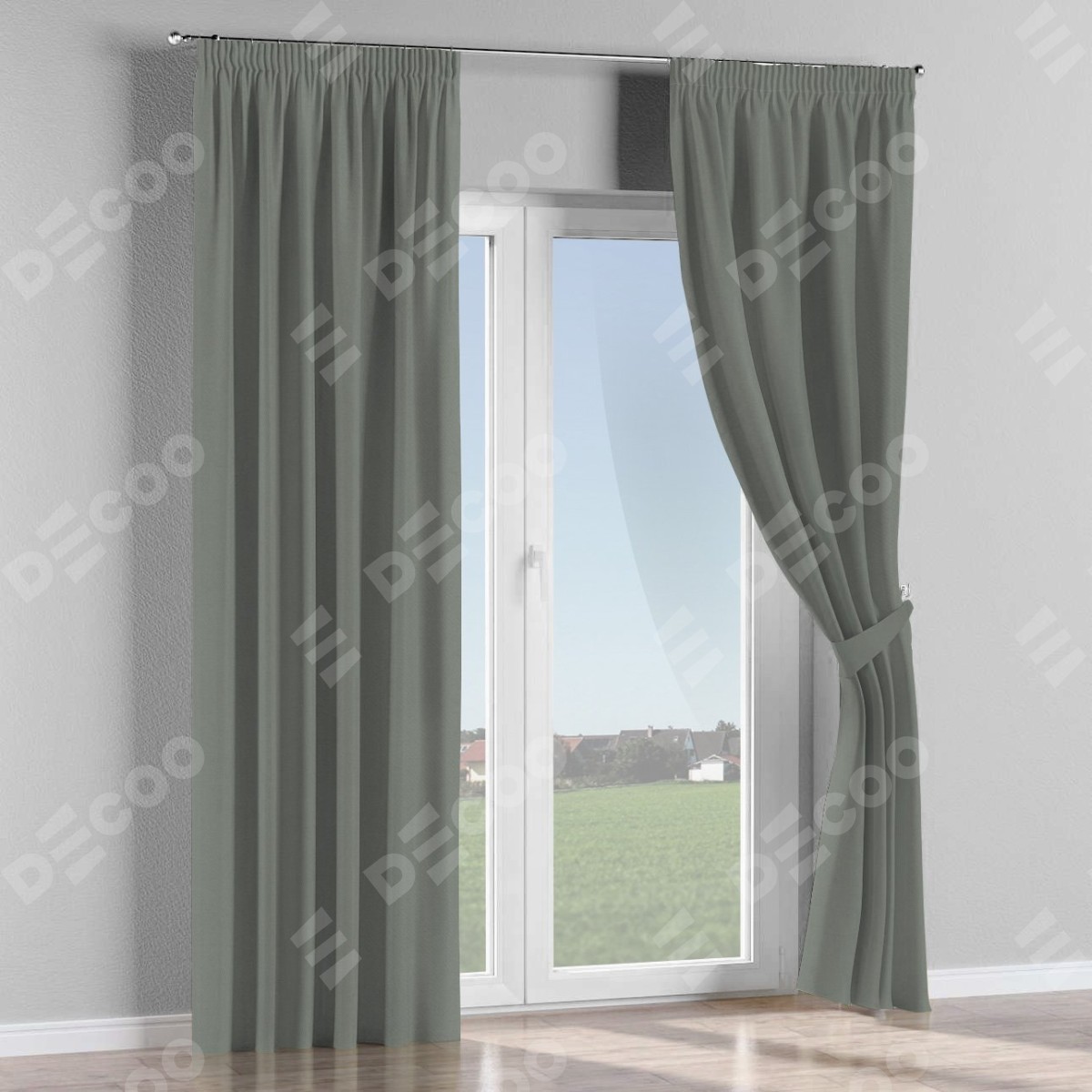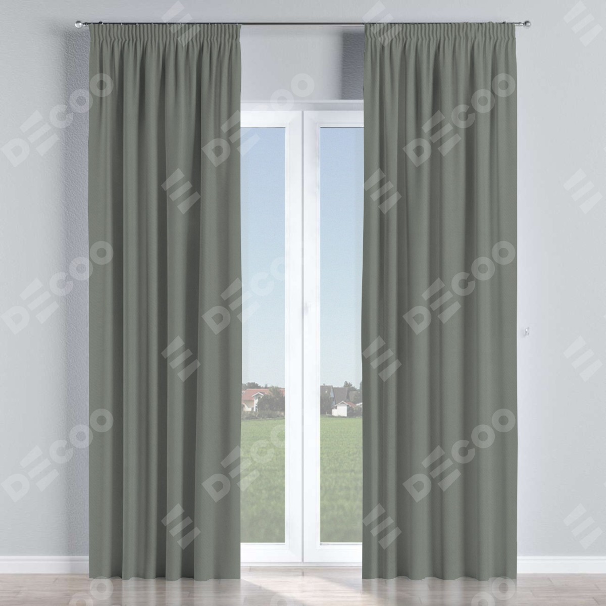 Комплект прямых штор, от производителя «Cortin», пошиты из ткани блэкаут однотонный тёмно-серый, артикул ткани 18077. С изнаночной стороны в верхней части штор пристрачивается шторная лента с декоративными складками «Карандаш». Для создания элегантных складок прямые шторы шьются по стандарту с коэффициентом 1:2 (на 100 см. ширины проёма 200 см. ширины ткани).