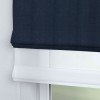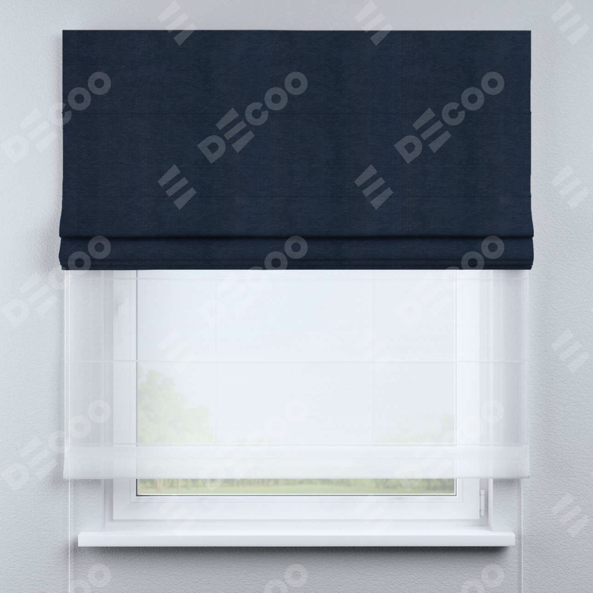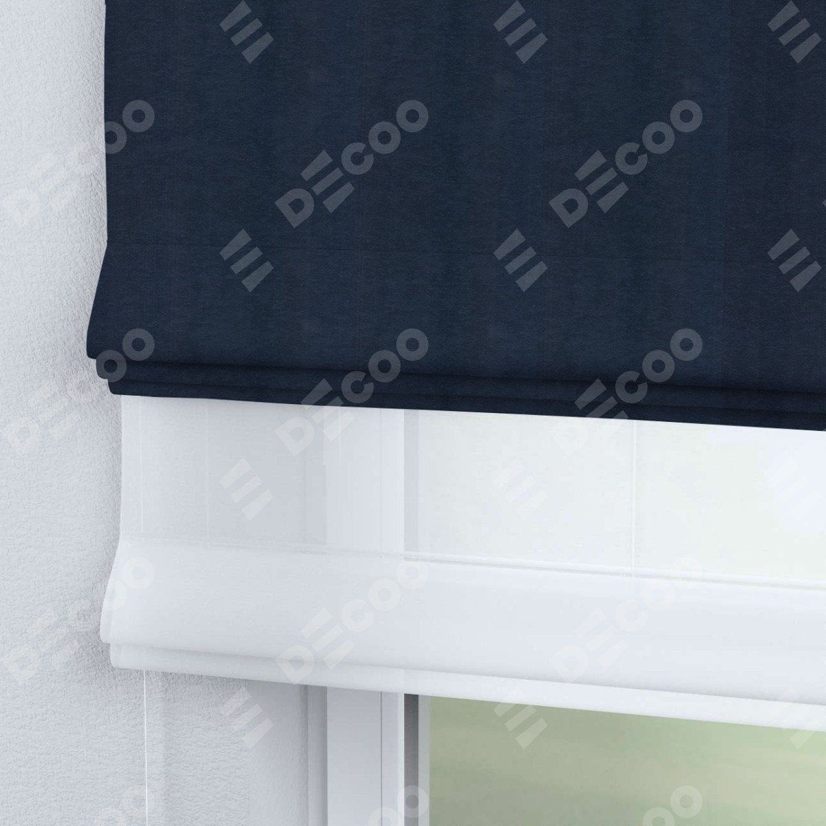 Римская штора день-ночь производителя «Cortin», используется для проёма, пошита из двух полотен, с лицевой стороны софт однотонный тёмно-синий артикул 33111, вторая ткань тюль (по стандарту комплектуется тюль белого цвета артикул V-01). Имеет универсальный механизм и подходит для монтажа: на потолок, на стену и в нишу.
