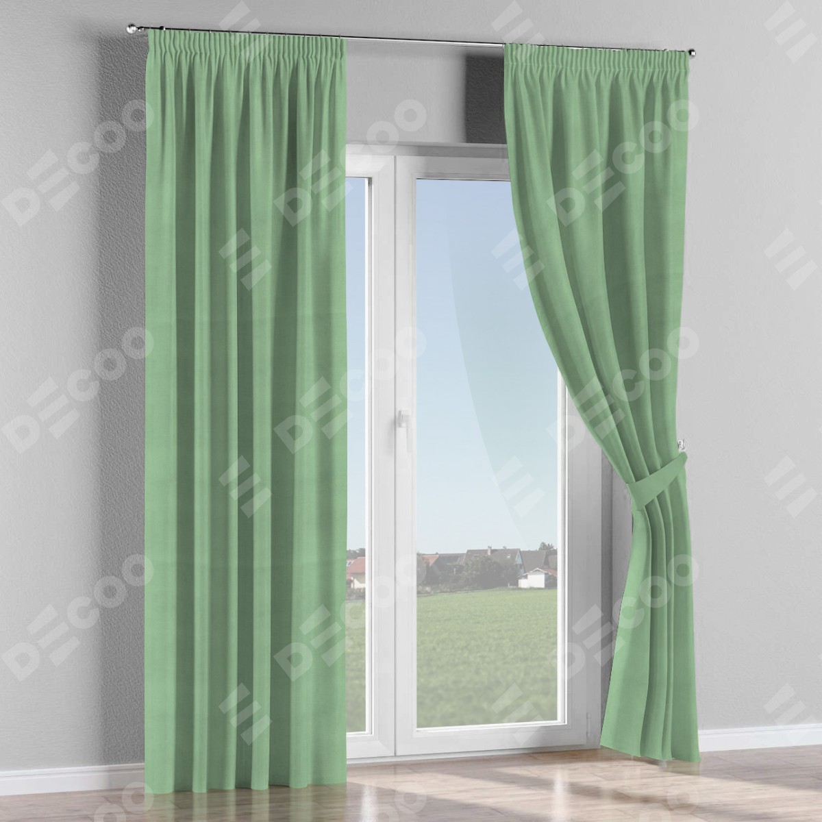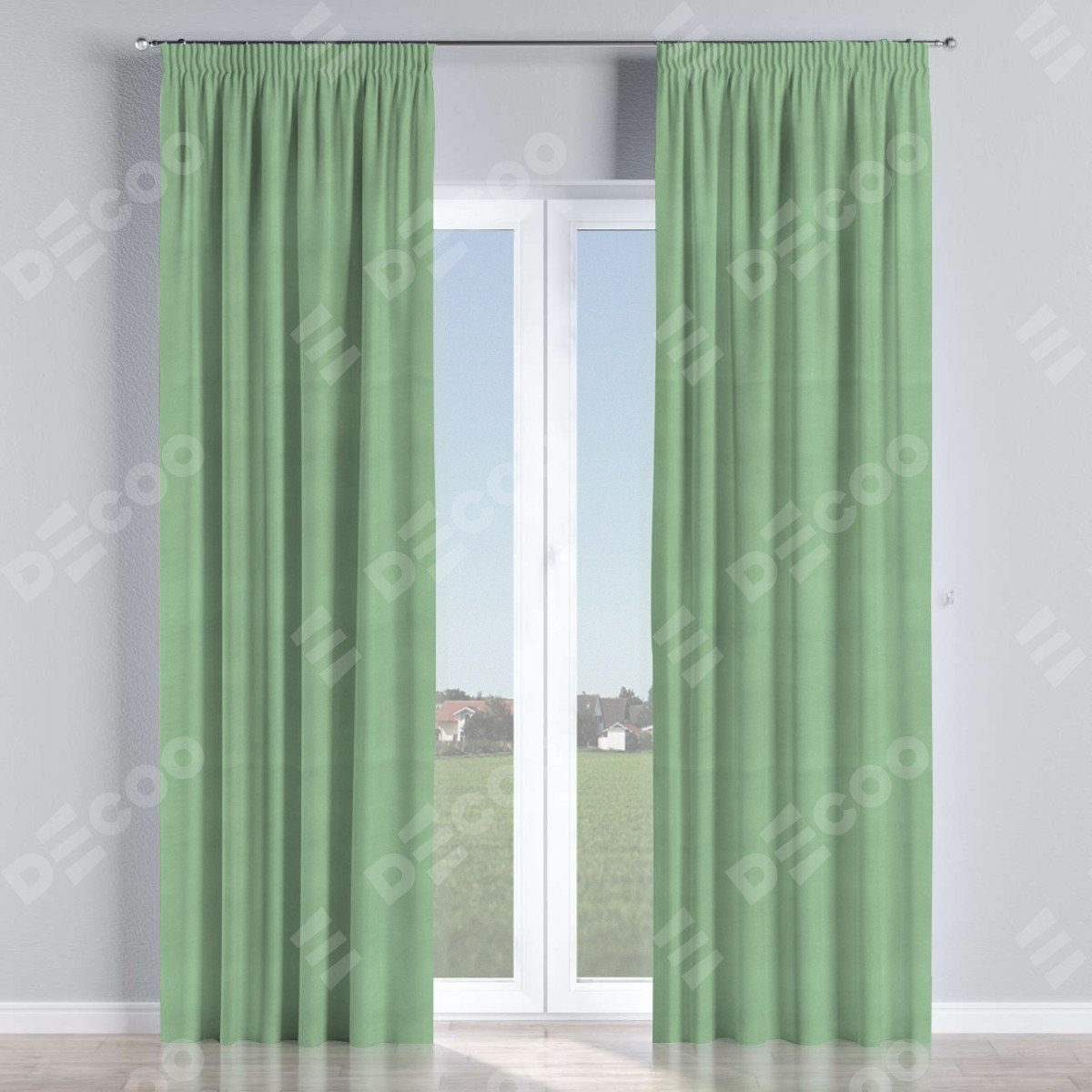 Комплект прямых штор, от производителя «Cortin», пошиты из ткани бархат оливковый, артикул ткани 18746. С изнаночной стороны в верхней части штор пристрачивается шторная лента с декоративными складками «Карандаш». Для создания элегантных складок прямые шторы шьются по стандарту с коэффициентом 1:2 (на 100 см. ширины проёма 200 см. ширины ткани).