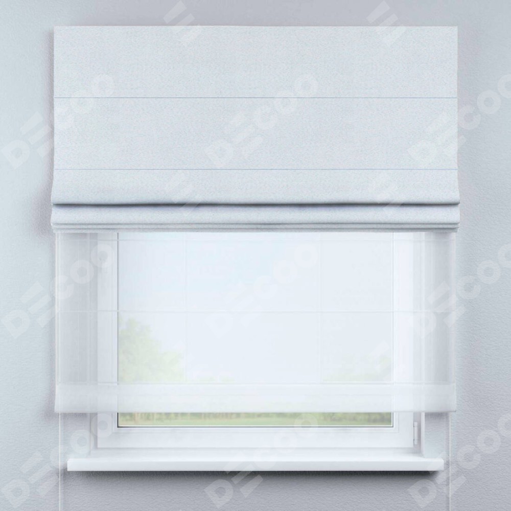 Римская штора день-ночь производителя «Cortin», используется для проёма, пошита из двух полотен, с лицевой стороны блэкаут однотонный дымчато-белый артикул 101, вторая ткань тюль (по стандарту комплектуется тюль белого цвета артикул V-01). Имеет универсальный механизм и подходит для монтажа: на потолок, на стену и в нишу.